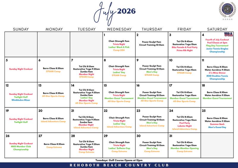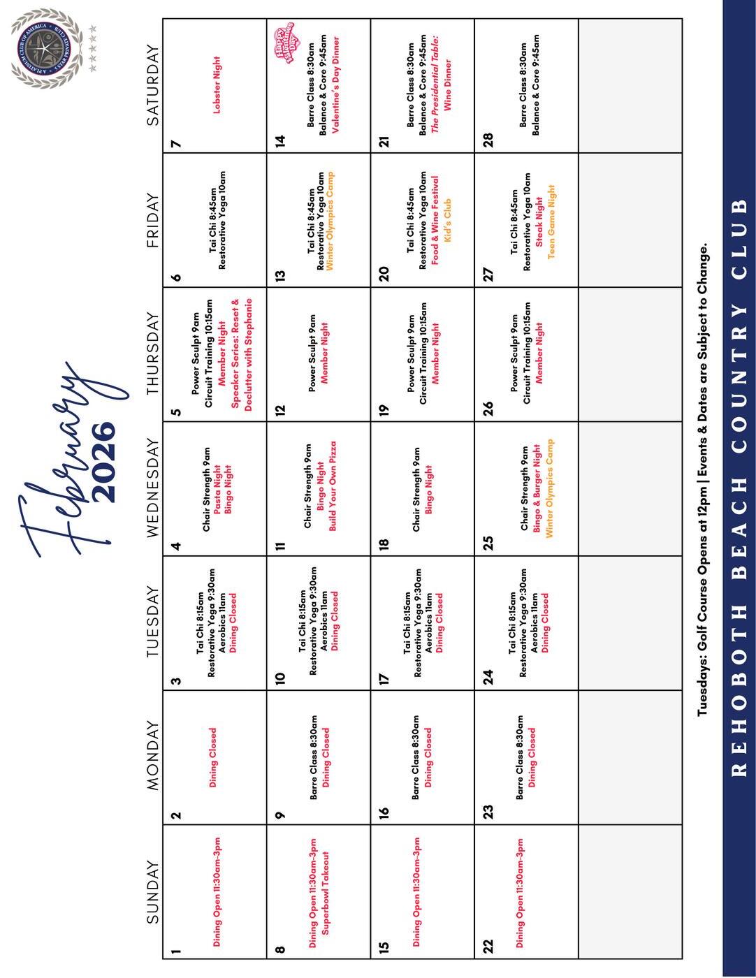 Hopefully you’ve had the chance to review the 2026 Calendar of Events and started to save the date this year! In March the Sports and Recreation Guide and the Social Event Guide will be sent to the membership. These will feature additional details on club-related events and tournaments