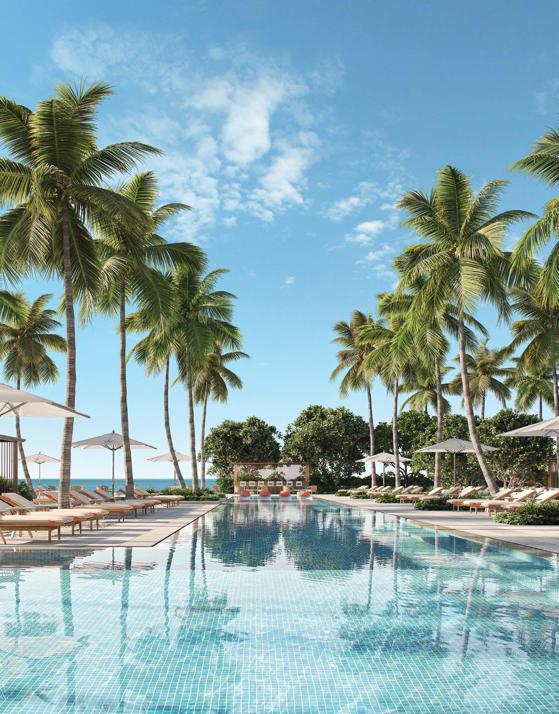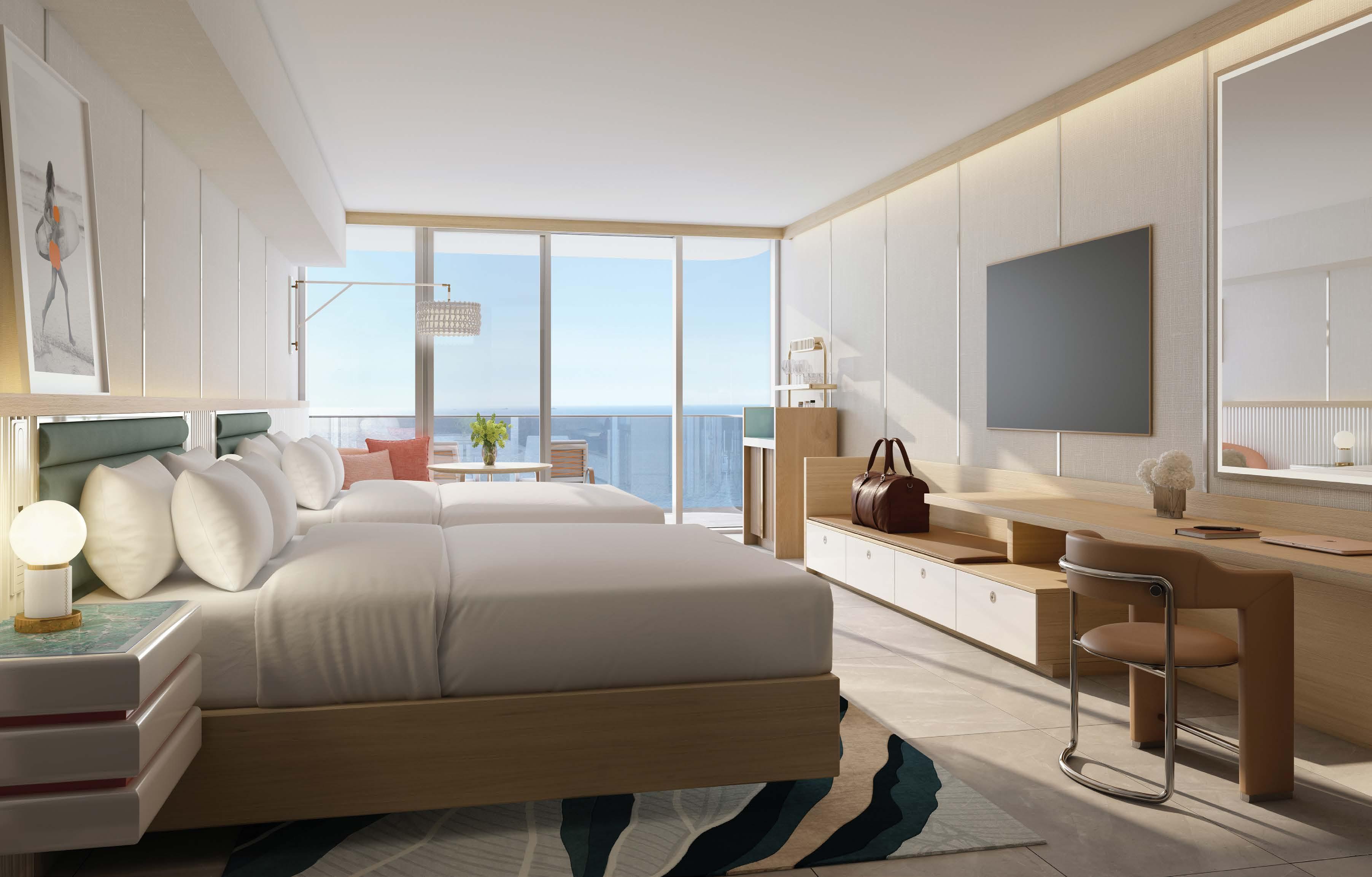 Interiors by Meyer Davis are designed in a fresh neutral palette, evoking warm, sandy shores, rich marine blues, and sunset corals. The Suites are light-filled and open, thoughtfully curated with soft organic textures and materials, offering breathtaking ocean views.