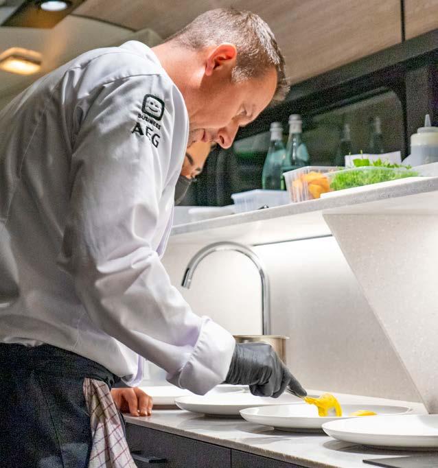 - Tornedos van varkensrug, appel en knolselder, jus met Calvados, mousseline van savooikool en lardons