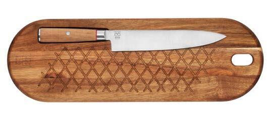 V0008 MELLTORP | Skjærebrett med brødkniv. Skjærebrettet er laget av FSC-sertifisert Acacia og brødkniven med sitt 25 cm lange blad er laget av 5Cr15MoV stål. Leveres i miljøvennlig gaveemballasje. Mål: 48x20x2cm. Knivlengde: 37,5cm, (knivblad 25 cm).