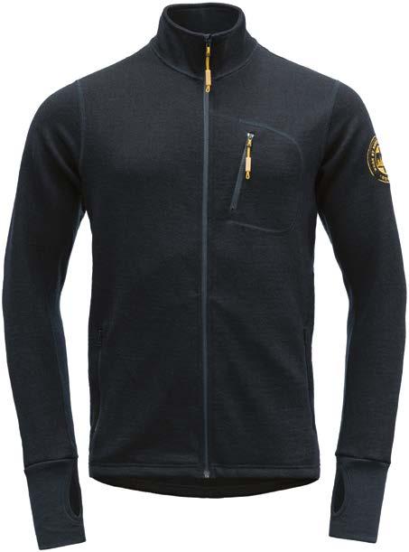 THERMO Jacket Herre marine/gule detaljer | THERMO Jacket Dame marine/turkise detaljer | Komfortabel mellomlagsjakke med svært gode varmeisolerende egenskaper. Jakken har kilefasong i siden for maksimal bevegelighet, og pulsvarmere med tommelhull. Brystlommen har kabelåpning. Devold® Thermo jacket består av 100% ren, ny ull. Den er godt egnet som isolerende mellomplagg, men passer også utmerket som ytterplagg på kalde og tørre dager. Størrelser herre: S-3XL. Størrelser dame: XS-XXL.