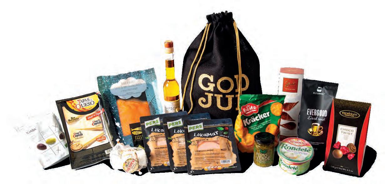 Innhold: Røkt laks 100 g skivet / Kalkunbryst urtemarinert 100 g / Lammerull 100g / Rapsolje hvitløk og timian 200 mg / Evergood dark roast kaffe 250 g filtermalt / Beste Kracker 150 g / President Rondele kremost med hvitløk 125 g / President Brie 5 x 30 g i nett / Hamlet Chocolas sjokoladeflak 125 g / Oksepastrami 100 g / Pesto Verde Fam. Labardi 130 g / Choco Twist 120 g / Forlasa tapasbrett 180 g / Olivenmix i pose 120 g / Julegløgg 0,33 l Tomtegløgg / Roastbiff 100 g skivet / Balso balsamvinegar og soya 200 g / Holmsens brente mandler 100 g / Stratos stor plate 150 g.