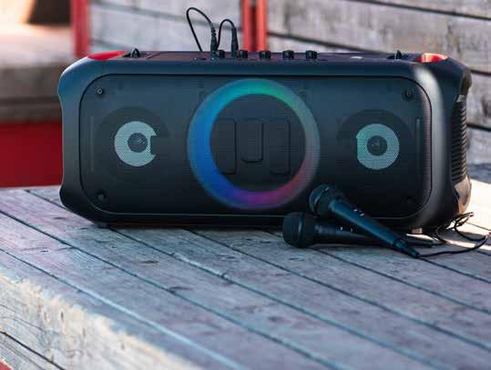 Transportabel og trådløs højttaler i XXL-størrelse med kraftfuld lyd, bas og integreret party-lys. Solid konstruktion med integrerede bærehåndtag og medfølgende skulderrem.