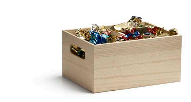 Julete “smellkaramell” (17,5 x 7 x 7 cm). Vi fyller den med 350 g valgfritt julegodteri og trykker din logo og budskap på emballasjen.