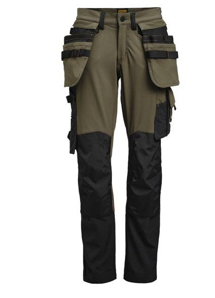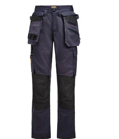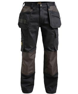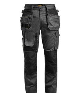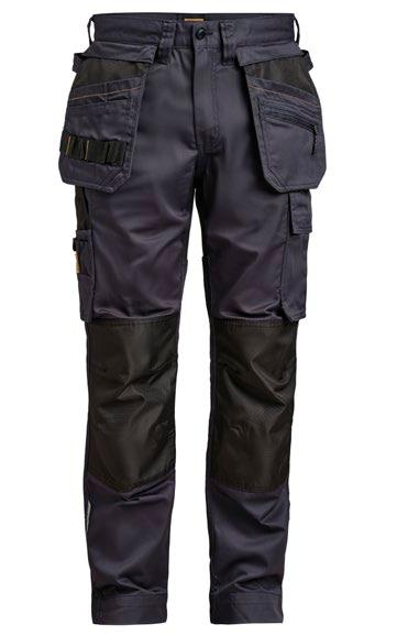 Smidig 4-vägs stretch i slitstarkt Rip-stop material. Grenkil med förstärkt stretch Cordura®. Rymliga hölsterfickor med extrafack och förstärkt insida, kan stoppas ned i framfickorna. Stolpfickor bak. Rymlig benficka med täckt blixtlås, ID-kortsfack och mobilficka. Hammarhank, tumstocksficka med knivhållare. Silikonbandet i byxlinningen håller byxan på plats, extra hällor för bältet på de större storlekarna.