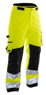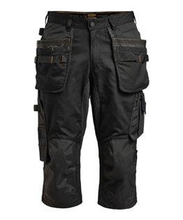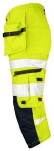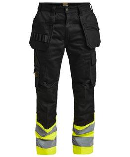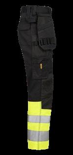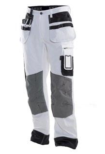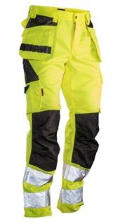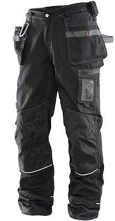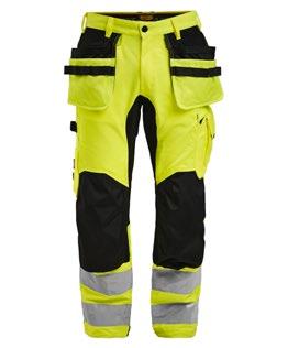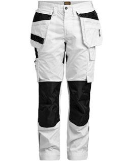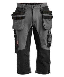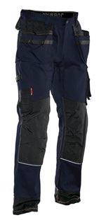 Smidig arbetsbyxa i 4-vägs stretch med partier av slitstarkt vävt tyg vid benslut, benfickor och hölsterfickor. Avtagbara hölsterfickor med zip-in funktion och med extrafack och förstärkt insida, kan stoppas ned i framfickorna. Stretchigt midjeband. Stolpfickor bak. Hammarhank. Tumstocksficka med knivhållare. Benficka med täckt blixtlås, ID-kortsfack och telefonfack. Förböjda knän med knäskyddsfickor i slitstark polyamid med 2 höjdnivåer för knäskydd inuti. Mesh i knävecken för ventilation. Byxbenet kan förlängas med 5 cm genom ett utvik i benslutet. Certifierad enligt EN 14404:2004+A1:2010 Typ 2 Nivå 1 tillsammans med Jobmans knäskydd 9943, 9944 och 9945.
