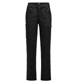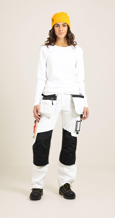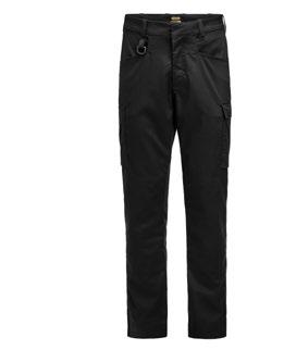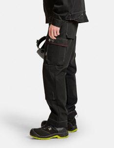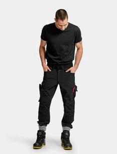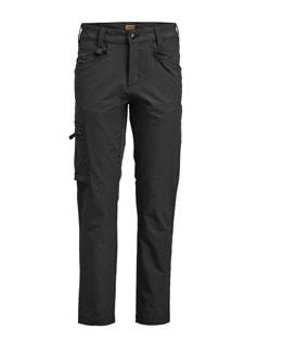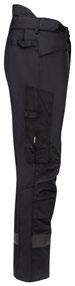 Servicebyxa med stretch. Dold knapp fram för ”Non-scratch” design. Benficka på högersida med plats för tumstock och benficka på vänster sida med ficklock med plats för pennor. D-ring i hällan fram för ID-korthållare. Knäskyddsficka på insidan. Byxan är något mindre i storlek då elastiken i midjan är fastare för bättre hållbarhet. Eftersom byxan är helt i stretch kan innerbenslängden upplevas kortare. Byxbenet kan förlängas med 5 cm genom att enkelt sprätta den röda sömmen.