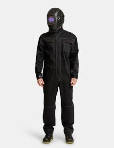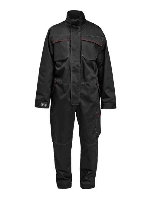 100% flamskyddsbehandlat bomull. CE-certifierat, testat och godkänt enligt EN ISO 11611 och EN ISO 11612. Certifieringen innebär att materialet och plaggets design skyddar mot kantantändning och flamspridning, det smälter inte. Det står också emot hetta enligt testnormerna vilket motverkar brännskador.