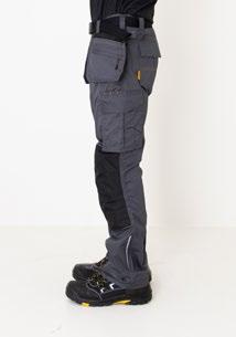 Smidig 4-vägs stretch i slitstarkt Rip-stop material. Grenkil med förstärkt stretch Cordura®. Rymliga hölsterfickor med extrafack och förstärkt insida som kan stoppas ned i framfickorna. Silikonbandet i byxlinningen håller byxan på plats. Extra hällor för bältet på de största storlekarna. Stolpfickor bak. Hammarhank, tumstocksficka med knivhållare. Benficka med täckt blixtlås, ID-kortsfack och telefonficka. Förböjda knän med knäskyddsfickor i slitstark stretch Cordura® med 3M™ reflexpasspoaler och två höjdnivåer. Mesh i knävecken för ventilation. Reflexdetalj för ökad synbarhet i knävecken. Förstärkningar i Cordura® och polyamid.