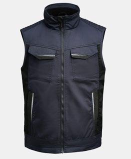 Quiltfodrad serviceväst i lättskött polyester/bomull. Två bröstfickor med kardborrestängning, D-ring i vänster bröstficka för ID-kort. Borstad mjuk polyester i kragen. Framfickor med blixtlås. Två innerfickor, en stor för dokument och en för mobiltelefonen. Reglerbar nederkant. Reflexer framtill på ficklock. Förlängd i rygg med reflexpasspoal.
