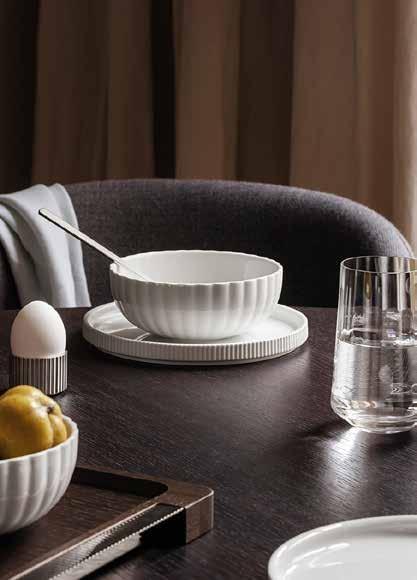 Denne elegante og diskré porselensskålen - dekorert med myke riller som innbyr til berøring - passer perfekt til alt fra frokostblanding til suppe eller salater. Når den kombineres med matchende tallerkener og glass, gir den måltidene et element av moderne skandinavisk stil.