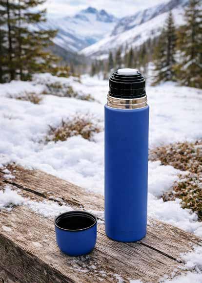 Dobbeltisolert, solid og pulverlakkert ståltermos i to størrelser. Termosen holder drikke kald opptil 24 timer eller varm opp til 12 timer. Skrukork med trykk-knappåpning. Leveres i gaveeske.