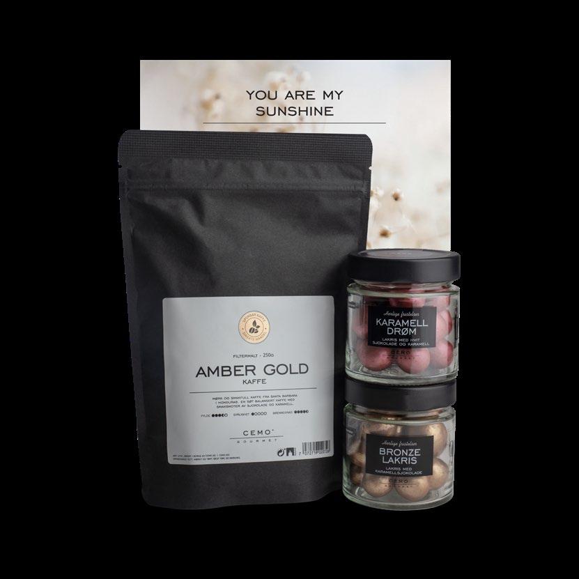 Denne gaveposen er satt sammen for å spre glede, energi og litt ekstra luksus i hverdagen. Her finner du aromatisk Amber Gold filtermalt kaffe, den unike kombinasjonen av sødme og dybde i Bronze Lakris, samt uimotståelig søte Karamelldrøm.