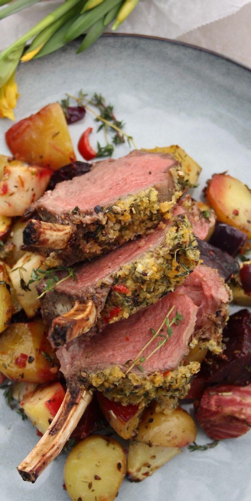 Nyt en deilig lammecarré med smakfull urteskorpe.
