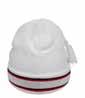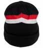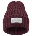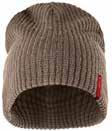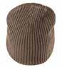 Enkeltstrikket lue i akryl med smale ribber . Oppbrett og fire dekorative sømmer på toppen