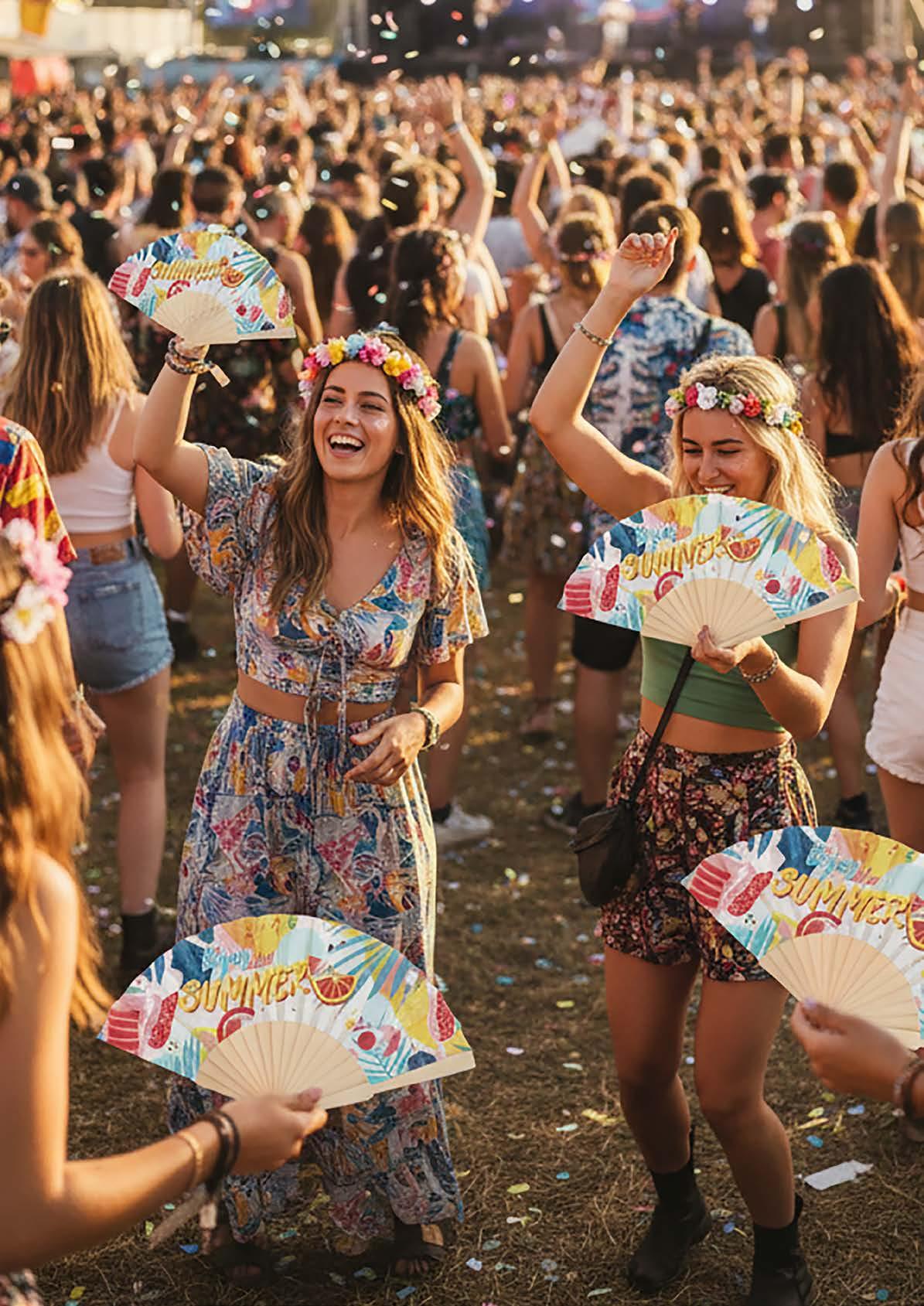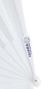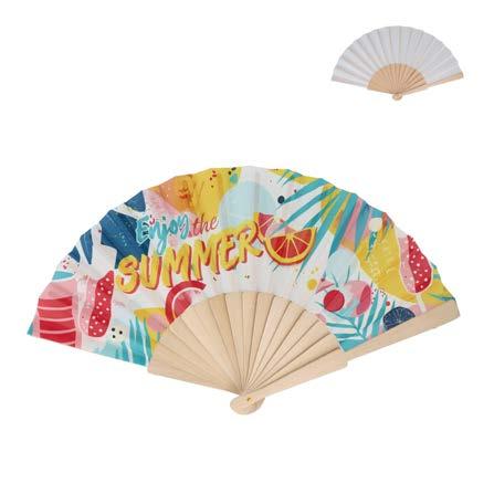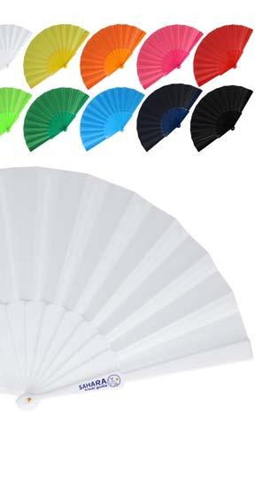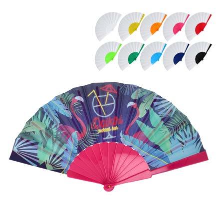 Håndvifte laget av plast og polyester. Tilgjengelig i en rekke lyse farger, ideell for utendørs arrangementer og varme sommerdager.