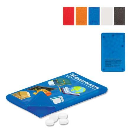 Rund og flat beholder med mintpastiller. Velg mellom transparente farger eller hardfarget hvit. Ca. 6,5 gram.