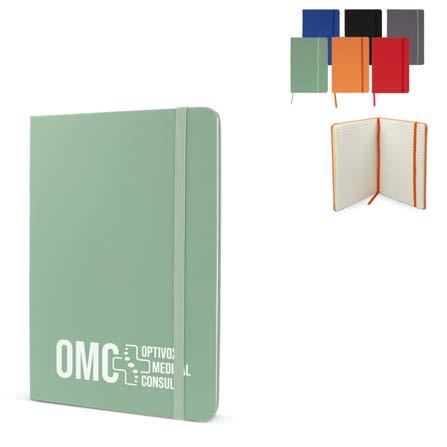 A5-notatbok med pappomslag, avrundede hjørner, farget elastisk strikk til lukking, markeringsbånd og penneløkke. Inkluderer 80 linjerte, kremfargede sider laget av resirkulert papir. Et praktisk og miljøbevisst valg til hverdagsbruk.
