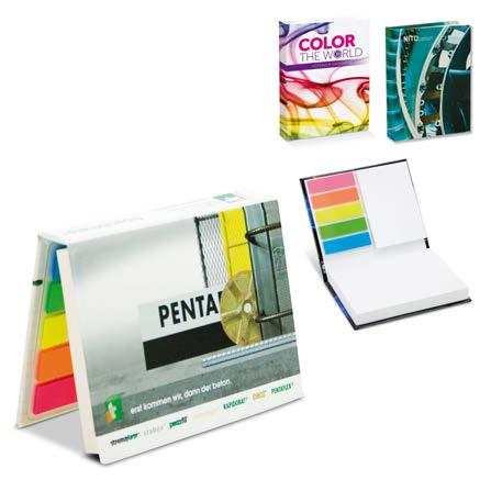 Liten notatblokk med klistrelapper, tilgjengelig i brunt, sort og hvitt omslag. Det brune og hvite leveres med gule klistrelapper, den sorte leveres med hvite klistrelapper. Inkludert 5 fargede markeringslapper.