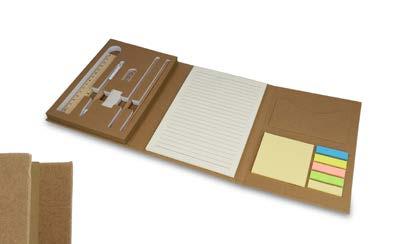 Dette bærekraftige tredelte skrivesettet har et omslag laget av 120 g/ m² resirkulert håndverkspapir. Settet inneholder en notisblokk med 40 ark kremfarget papir, en notatblokk med 25 ark, fem farger klistrelapper (25 ark hver), en blyant i ospetre, en linjal i furu, en spisser i bøk med karbonstål, en visittkort-lomme og en penn i håndverkspapir.