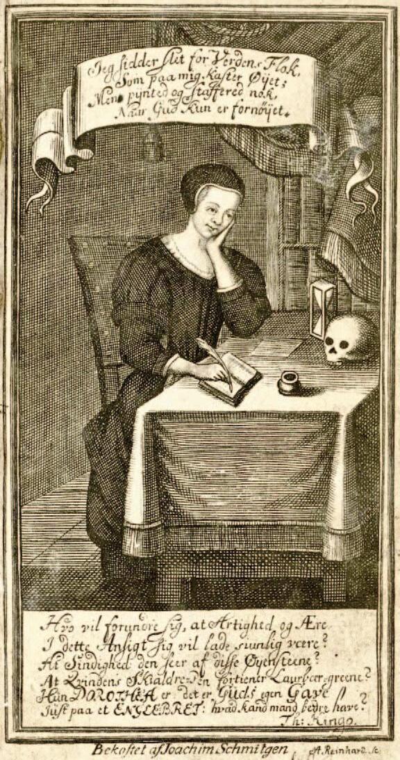 Portrett av Dorothe Engelbrektsdatter, hentet fra en utgave av boken "Sjælens Sang-Offer" fra 1732. Teksten under bildet er et vers av Kingo, hvor det bl.a. står: "Hvo vil forundre sig, at (...) Qvindens Skialdre-Pen fortiener Laurbær-greene?" Kilde: Wikimedia Commons