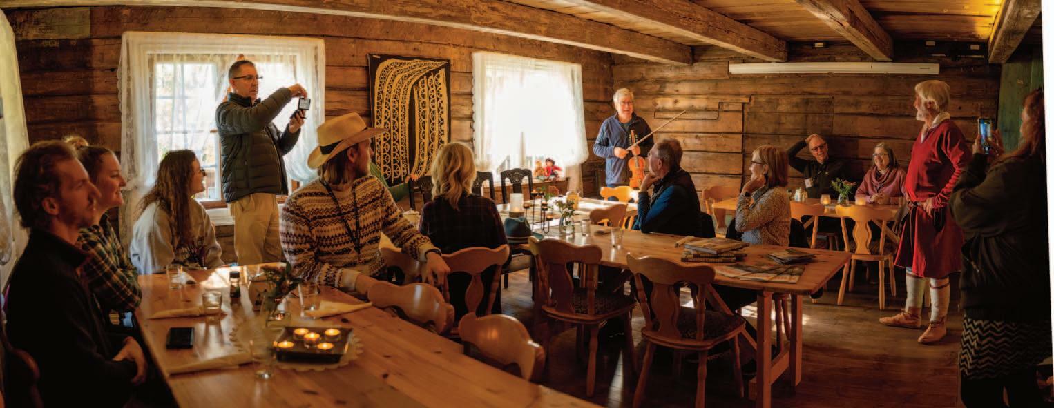 Fra Nansen reiste vi bakover i tid –langt bakover. De første boplassene man har funnet på vidda er 7500 år gamle, godt tilbake i steinalderen. Fortellingen om «fjellet, skogen og vidda» ble drevet helt frem til fredningen av store skogområder i 2008 –og til dagen i dag, hvor skogens evne til å binde CO2 vil være avgjørende i møte med klimaendringene. Vi hørte om fjellflora og stadnavn, bågåsteller, kølgroper, jønnutvinning, nordmannsslepa og skreppekarene, lakterved og fløyting. En flott reise!