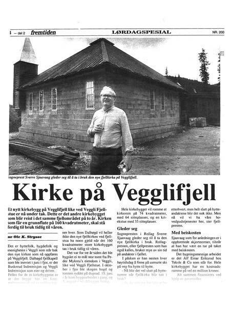 De hadde også støtte hos sognepresten. I en avisartikkel fra 1992 kan vi lese: «Rollagpresten er blitt kjent langt utover dalens grenser for sine årlige, hyppige andakter og messer på Vegglifjell. Bare i påskeuken kan det bli opp til femten påskemesser i private hytter. Og den gode responsen sogneprest Sjaavaag har fått, gjør at han ser et stort, udekket behov for en fjellkirke i området».
