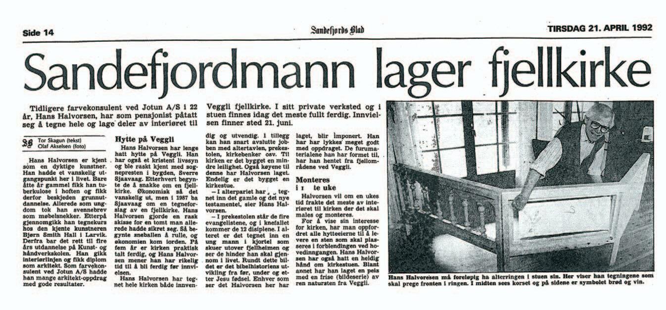 Når man kommer inn i Veggli fjellkirke i dag, er det i stor grad Hans Halvorsen visjon man trer inn i. I et intervju med Sandefjords Blad fra 1992 kan vi lese om Halvorsens bakgrunn: «Halvorsen er kjent som en dyktig kunstner, men hadde et vanskelig utgangspunkt her i livet. Bare åtte år gammel fikk han tuberkulose i hoften og fikk derfor en beskjeden grunnutdannelse. Allerede som ungdom tok han svennebrev som møbelsnekker. Etterpå gjennomgikk han tegnekurs hos den kjente kunstneren Bjørn Smith Hall i Larvik. Deretter gikk det rett til fire års utdannelse på Kunst og håndverkskolen hvor han gikk interiørlinjen og fikk diplom som arkitekt.»