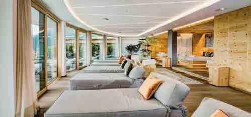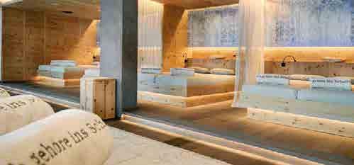 • Panorama-Spa: 40 m² Panoramasauna für 25 Personen mit einem spektakulären Ausblick auf die Serfauser Bergwelt, Ruhebereich