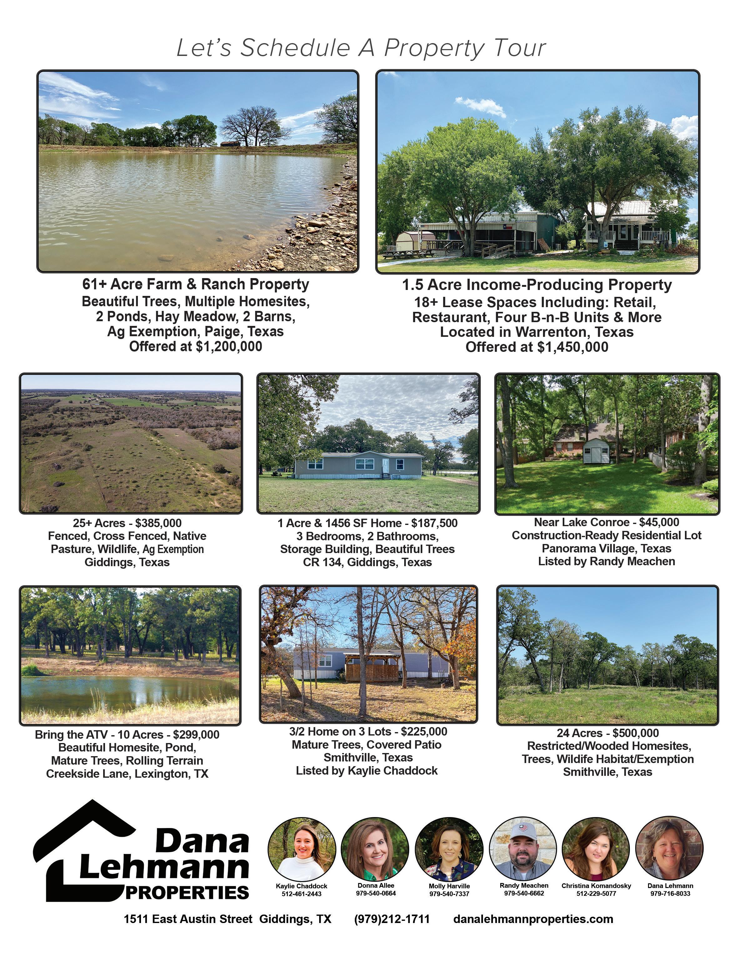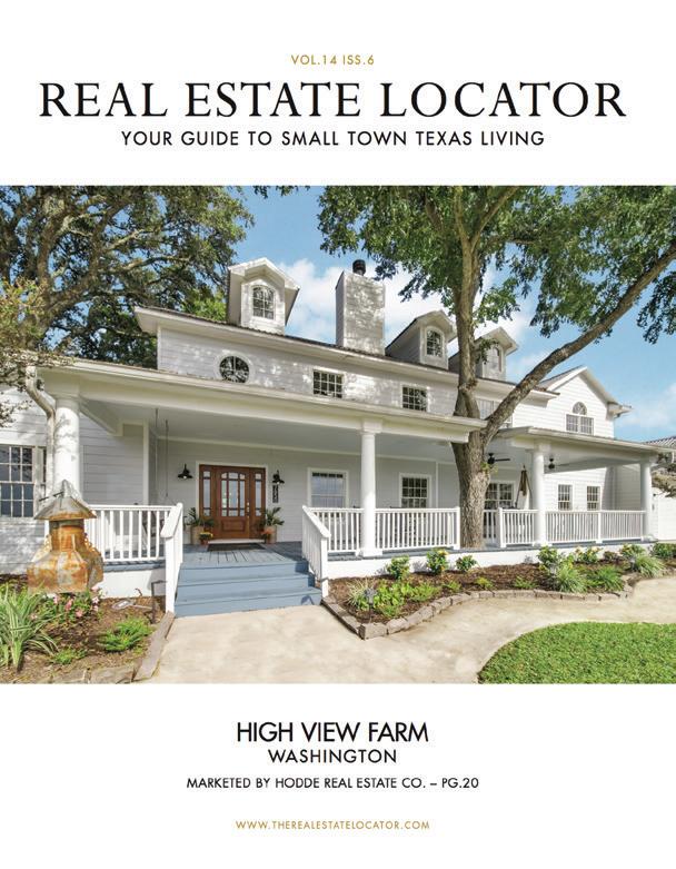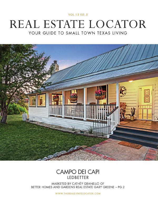 4 WWW.THEREALESTATELOCATOR.COM ADVERTISING INFO: 979-249-7584 PEG@CVCTX.COM All material presented herein is intended for informational purposes only. Information is compiled from sources deemed reliable but is subject to errors, omissions, changes in price, condition, sale, or withdrawal without notice. All measurements and square footages are approximate. Exact dimensions can be obtained by retaining the services of an architect or engineer. This is not intended to solicit property already listed. Nothing herein shall be construed as legal, accounting or other professional advice outside the realm of real estate brokerage. Compass is a licensed real estate broker. Equal Housing Opportunity. The Real Estate Locator P.O. Box 328 Round Top, Texas 78954 Publisher Peg Woelky-Richardson 979.249.7584 peg@cvctx.com Art Director Shelley Lai 361.746.4376 contact@shelleylai.com Distribution Peg Woelky-Richardson 979.249.7584 peg@cvctx.com Printed By Shweiki Media San Antonio, Texas The Real Estate Locator is published and distributed every eight weeks. Copies of this publication can be found in over 150 distribution sites in Austin, Colorado, Fayette, Gonzales, Lee, Waller and Washington counties along with portions of Harris and Fort Bend counties. Advertising is very important for the growth and image of any size company. We make every effort to keep our advertising rates affordable while presenting a quality publication you will feel proud to be associated with and can share with your sellers and buyers. Although every precaution is taken to ensure the accuracy of the published material, The Real Estate Locator cannot be held responsible for the validity of the advertisements. All rights reserved. Contents may not be reprinted or otherwise reproduced without the written permission of The Real Estate Locator. YOUR GUIDE TO SMALL TOWN TEXAS LIVING REAL ESTATE LOCATOR Bellville Brenham Bleiblerville Cat Spring Industry Flatonia Weimer La Grange Burton Chappell Hill Schulenburg Columbus Sealy Independence Hallettsville New Ulm Swiss Alp El Campo Sealy Smithville Giddings Ledbetter High Hill Ellinger Fryeburg Oldenburg Rutersville Muldoon Plum Cistern Engle Praha Waelder Washington Independance BELOW ARE THE MANY COMMUNITIES WE SERVE.