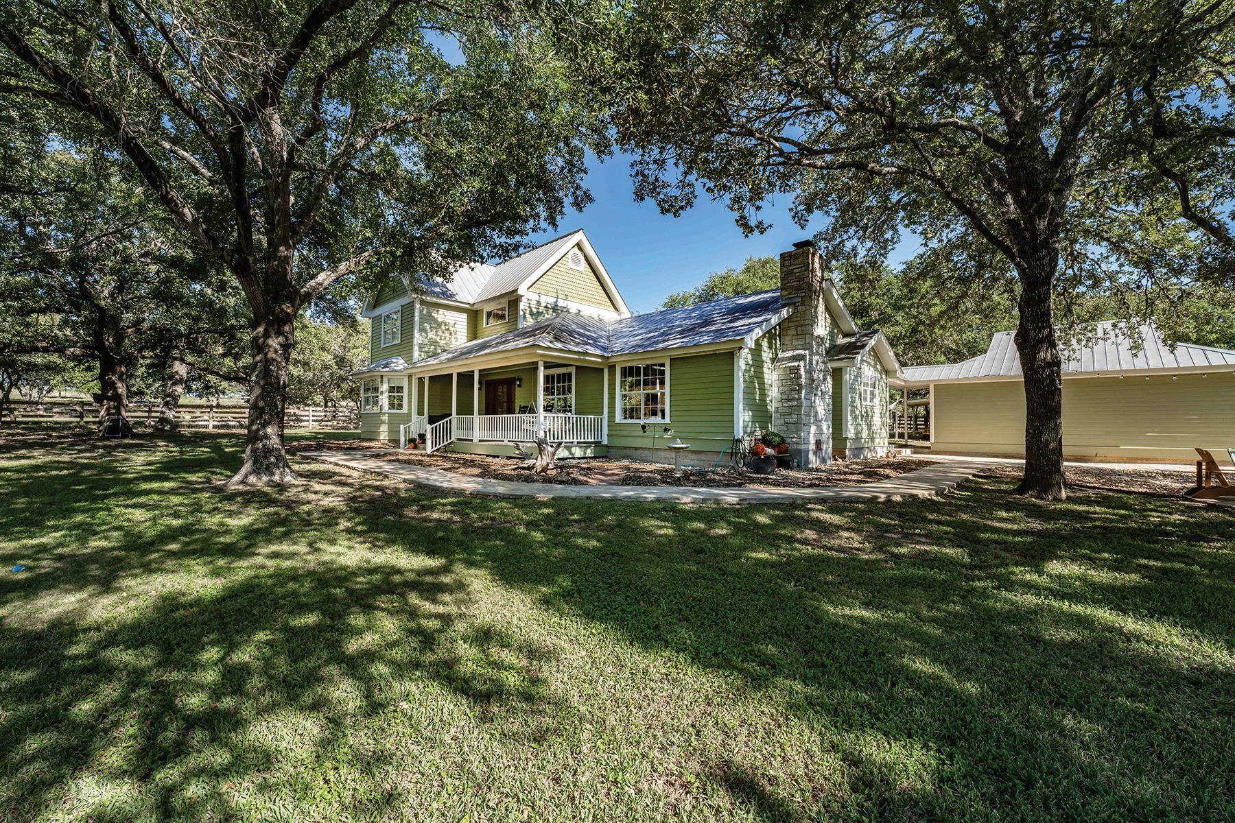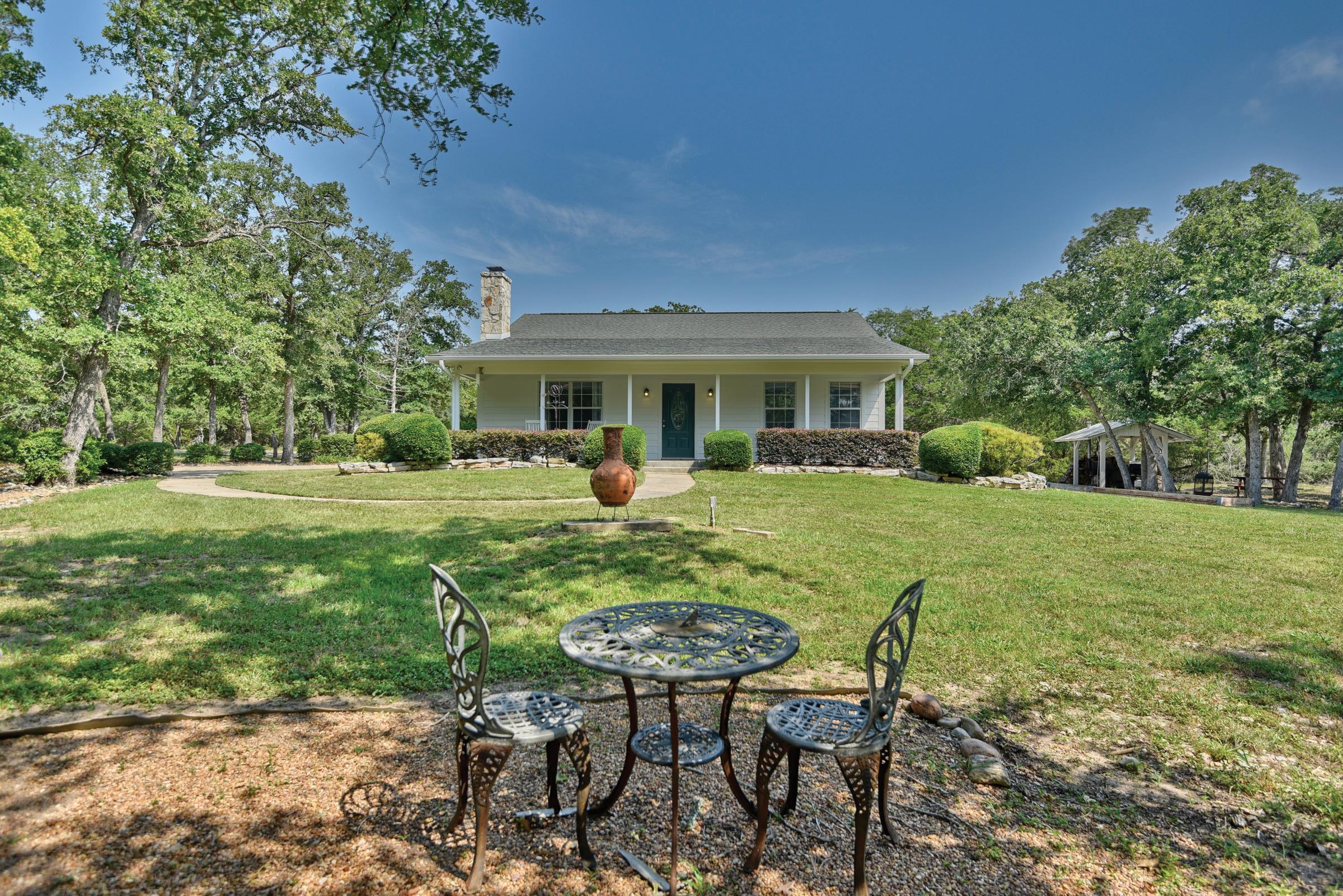 Classic French-style County Farmhouse on a very private 7.58 acre tract one mile from Round Top Town Square. Beautifully wooded with open areas, a large pond with fountain, gazebo, fire pit, tranquil front porch with rockers, side porch facing pond with outdoor living area and fireplace, this property is perfect for winding down. Interior has vintage wood floors, bead-board, wood plank walls and aged stone with antique beams. The kitchen is designed for upscale cuisine and entertainment. Primary bedroom down with beautiful bath, a guest bedroom down and 3 large bedrooms with ensuite bathrooms and gorgeous views from each window. A family room is upstairs with bar, large screen TV and did we say that this property comes furnished as you see in the photos? Yes! 5 BR, 4.5 BA. plus separate guest house. This property is hard to forget and even harder to leave.