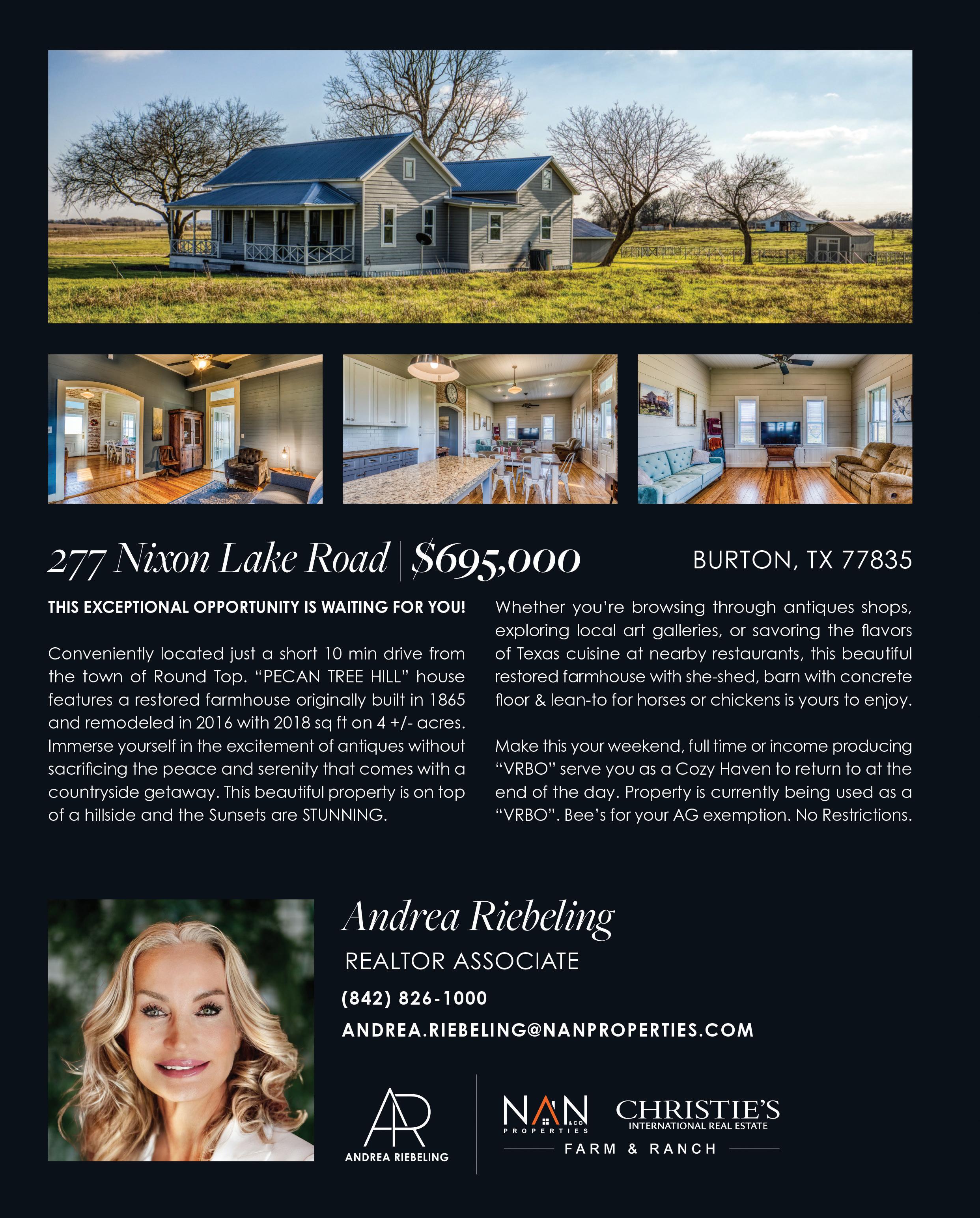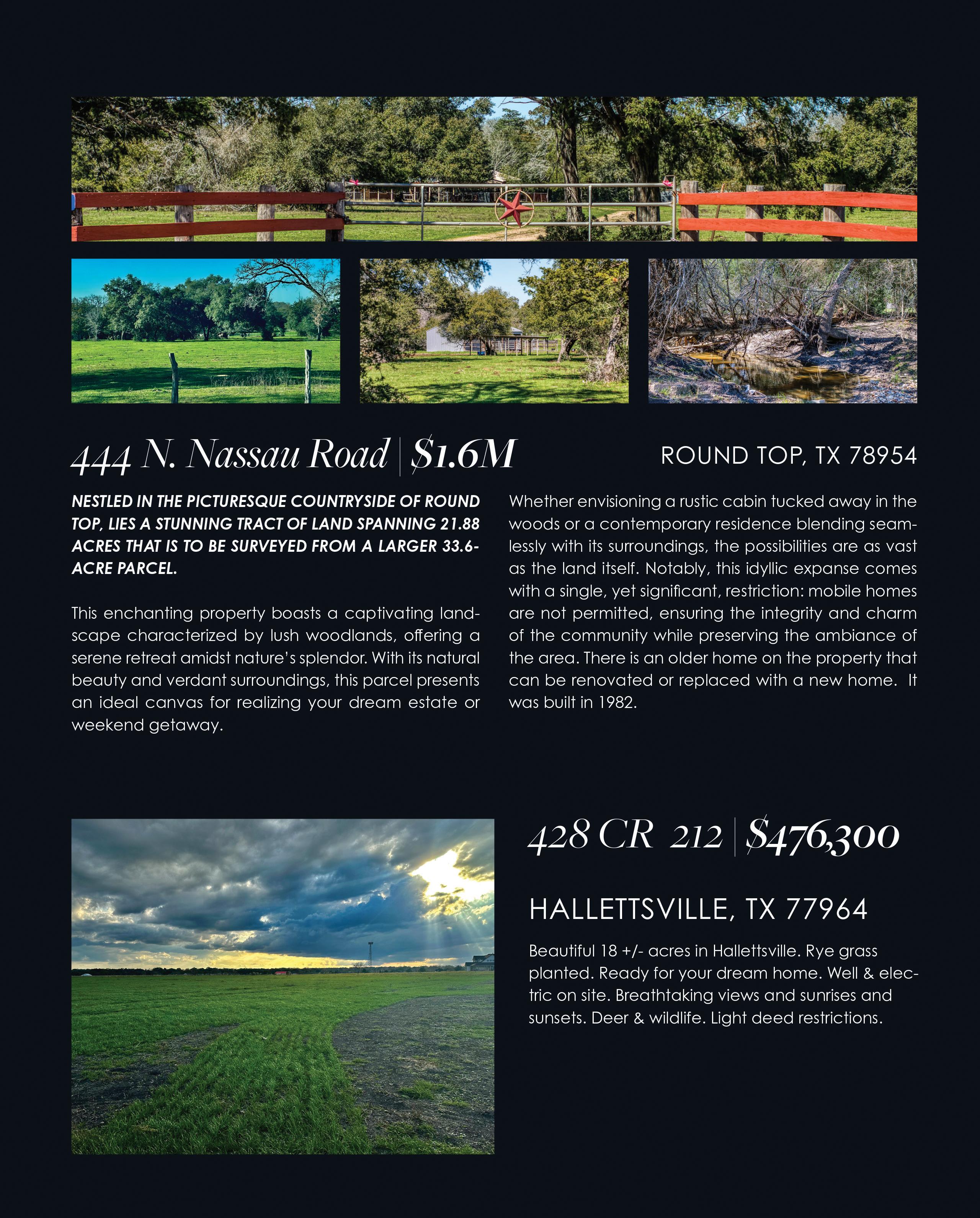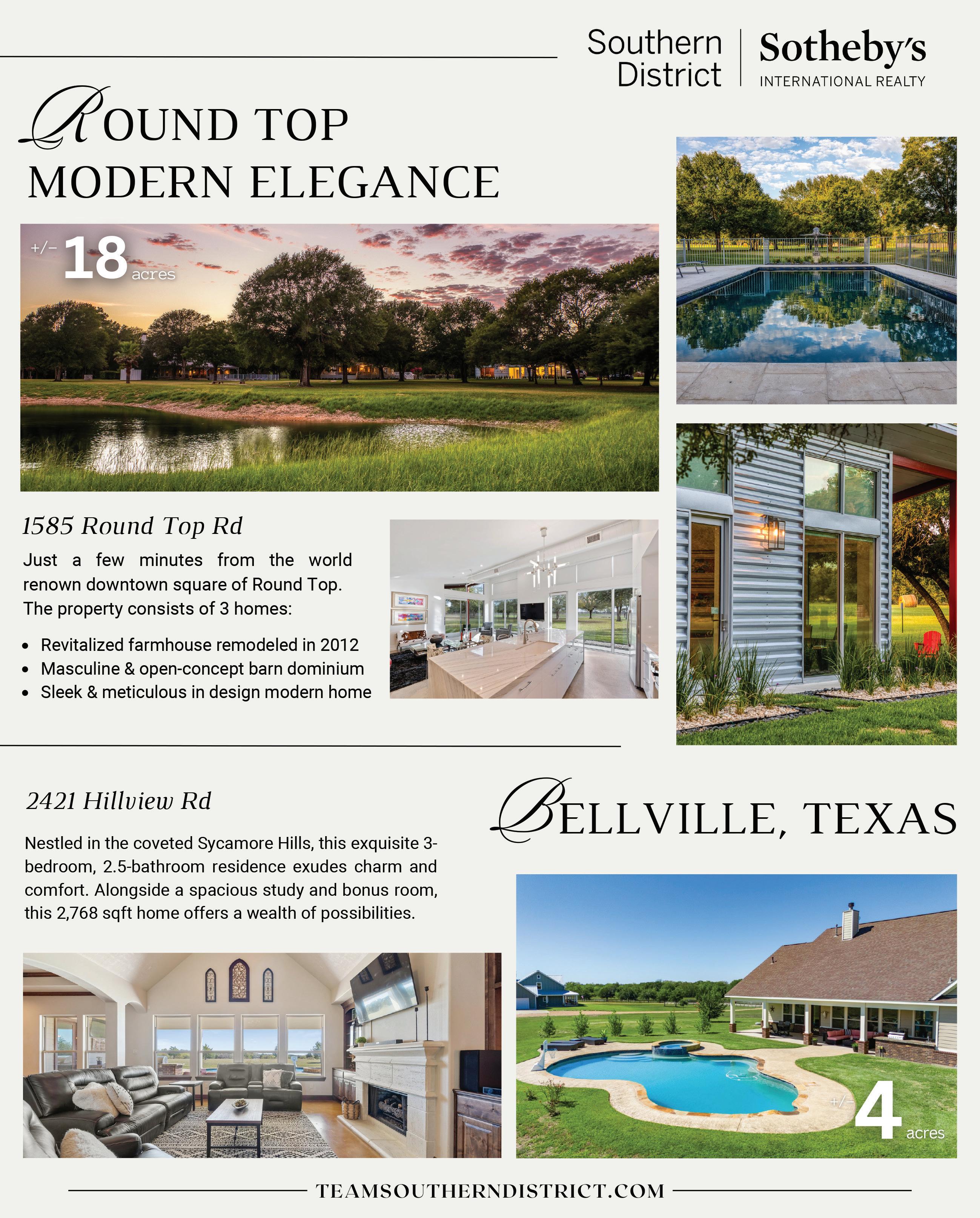 WWW.THEREALESTATELOCATOR.COM 57 ADVERTISING INFO: 979-249-7584 PEG@CVCTX.COM 101 Main St, Round Top, TX 78954 | 979-249-5732 | 103 N Main St, La Grange, TX 78945 www.roundtoprealestate.com TBD Track Road NEW ULM 53+ Acres | Lots of Trees | Nice Pastures | Pond | Creek | Rolling Terrain | Elevations range from 390 to 340 | Several Building Sites | Located minutes to New Ulm, The Falls, and The Big Easy Ranch TXLS #145474 | $995,000 1072 S Masonic BELLVILLE 5 BD/4 BA Home in Bellville | 1 BD/1BA Cottage | Spacious and Updated | Open Living - Dining - Kitchen Area | Primary Suite Downstairs | Additional Bedroom and Bathroom Downstairs | 3 Bedrooms and 2 Bathrooms Upstairs | Media Room Upstairs | Come call this home yours! TxLS #145559 | $679,000 ADAM MAYER Realtor Associate 979.966.9102 adam@roundtoprealestate.com CLAIRE MAYER ZAPALAC Realtor Associate 979.966.8211 claire@roundtoprealestate.com