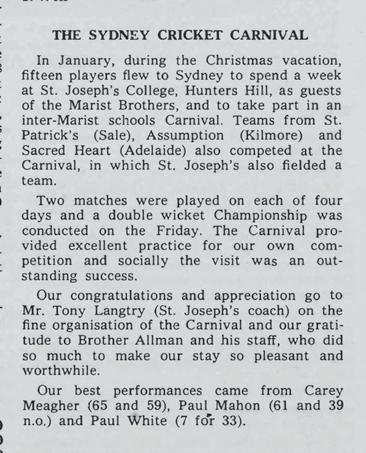 The concept of Marist Schools across Australia meeting annually on the cricket field was born from an idea tossed around between Br Jordan Redden (Sacred Heart College, Somerton Park) and Tony Lantry (St Joseph’s College, Hunters Hill) as they sampled some of the “spirit of the Institute” in Adelaide in 1973. A love of both the Marist traditions and the game of cricket, prompted the use of the second of these to further the ideals of the first. And so, from humble beginnings at Hunters Hill in 1974, where Sacred Heart College Adelaide, Assumption College Kilmore and Marcellin College Bulleen joined the host in a round robin of matches leading to a final, the carnival grew to maturity, attaining its twenty-first birthday in Adelaide in 1994. Along the way, St Patrick’s Sale replaced Kilmore in 1975, then Marist College Ashgrove, Marist College Canberra and Newman College Perth joined the others in Adelaide in 1976 and set the pattern for many years.