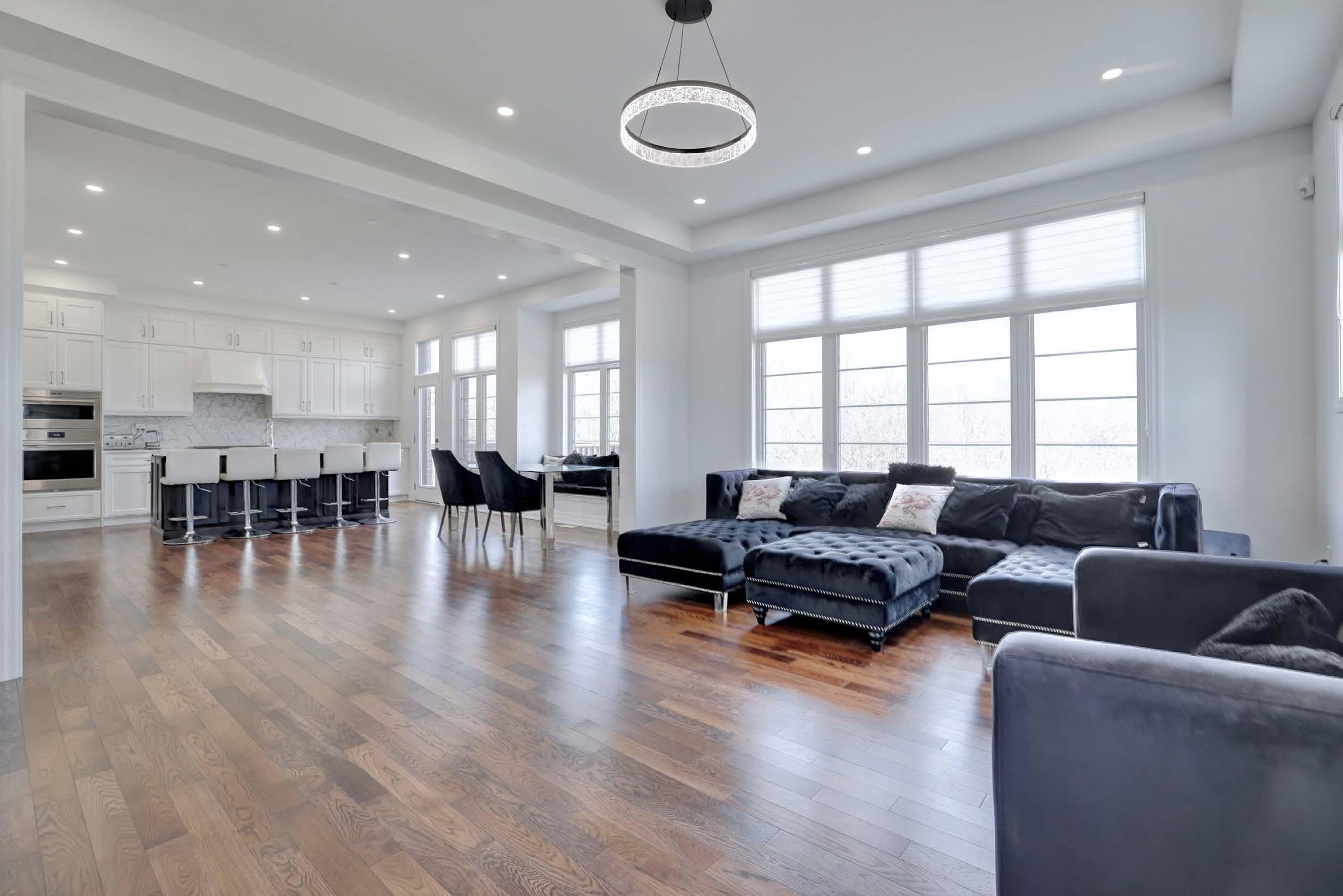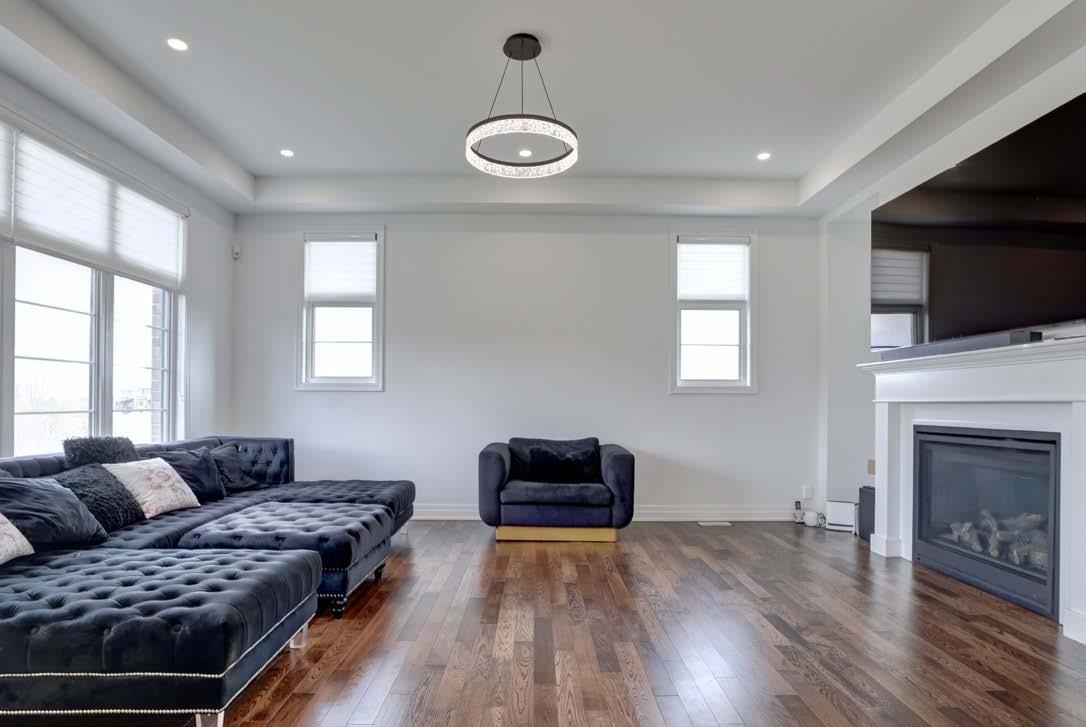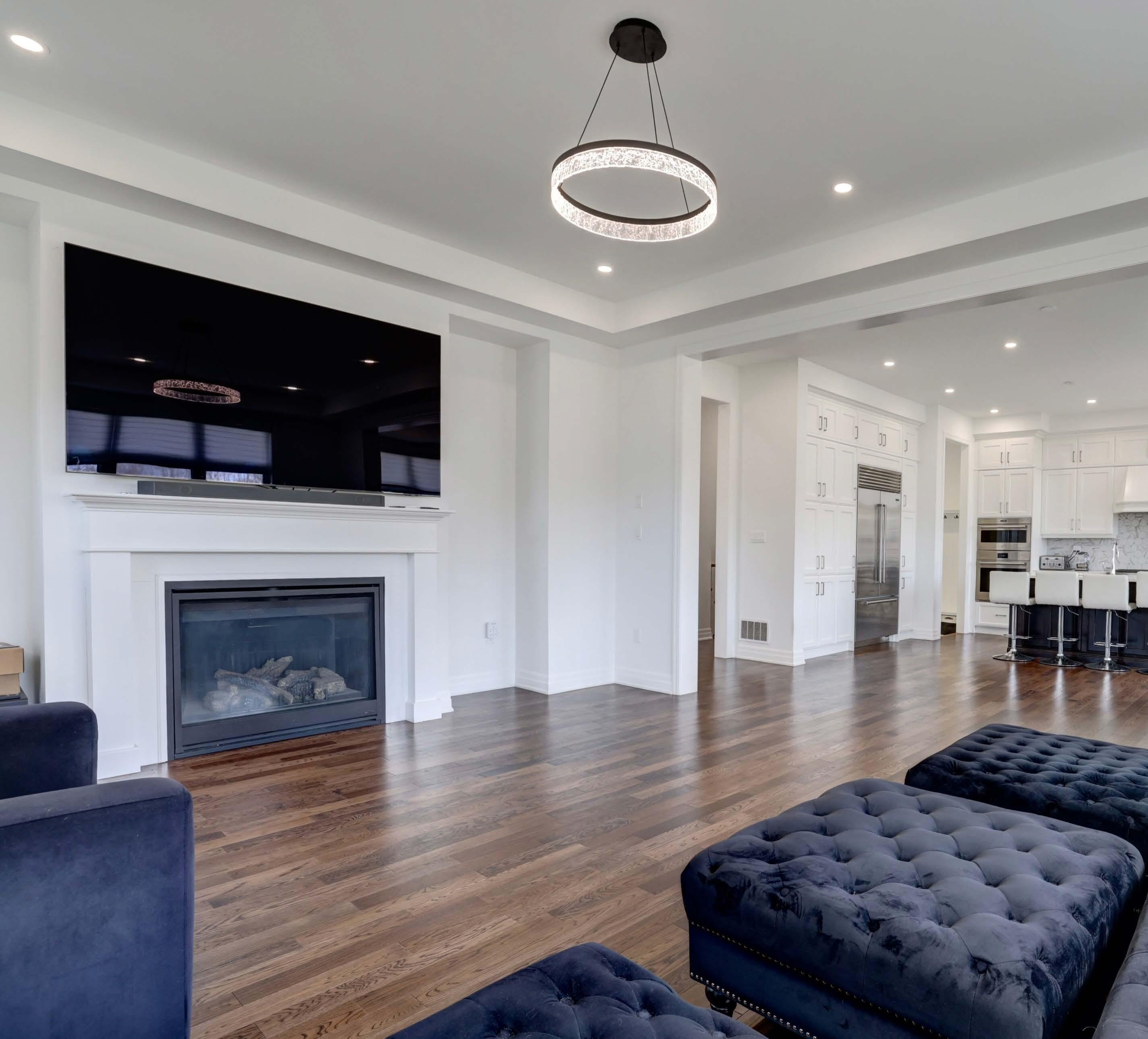 Great Room with Fire Place and Large Windows over looking a ravine Light-Filled