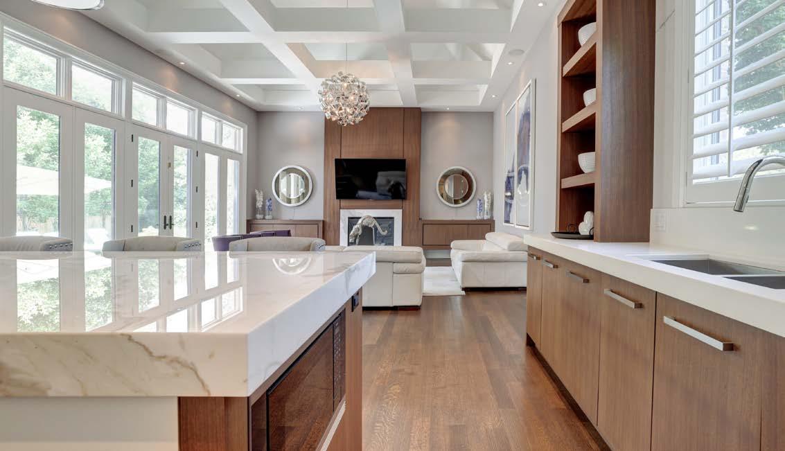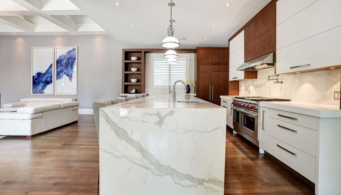 • Calacutta marble book matched kitchen island, backsplash and fireplace surround in family room