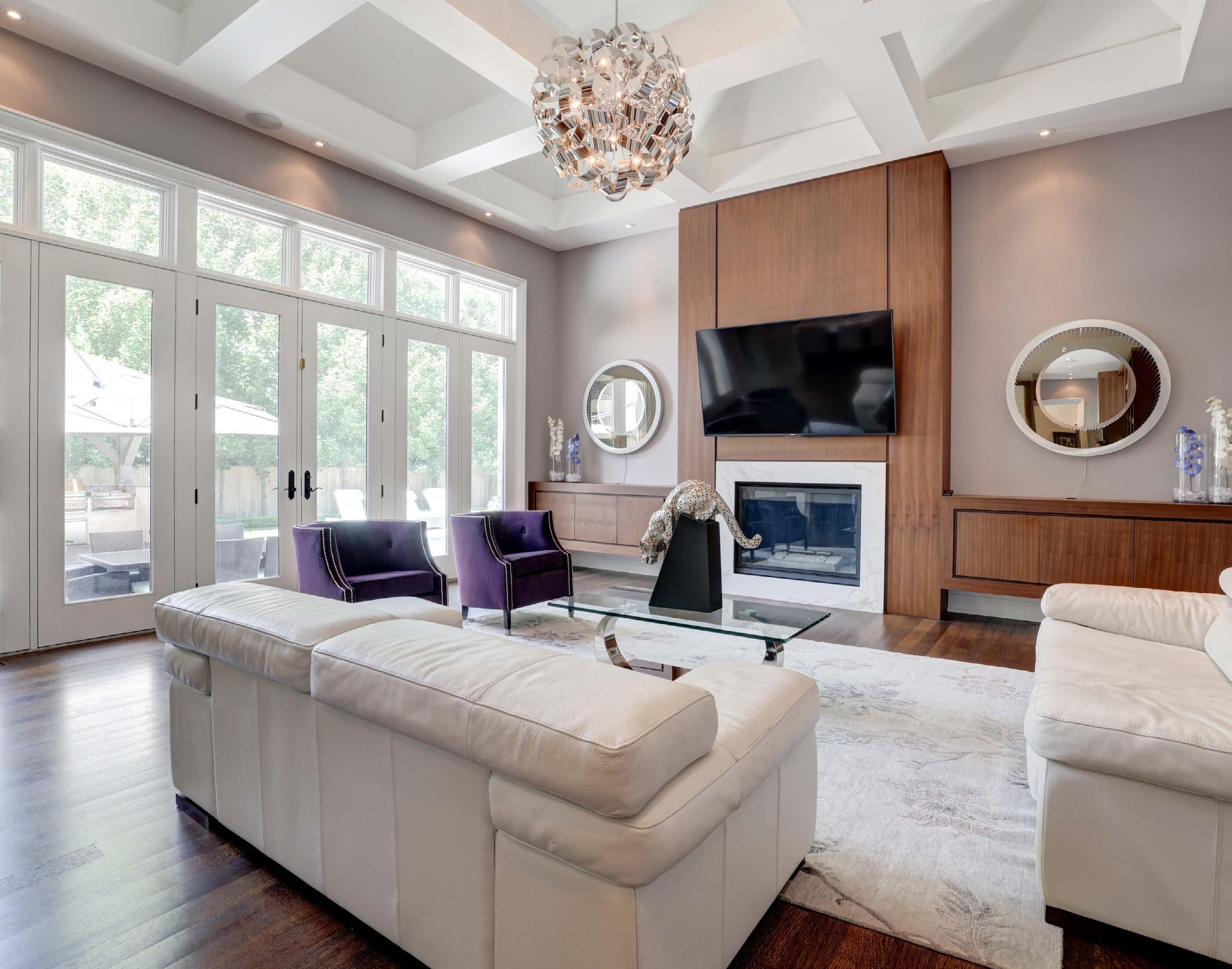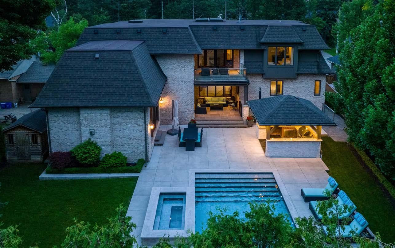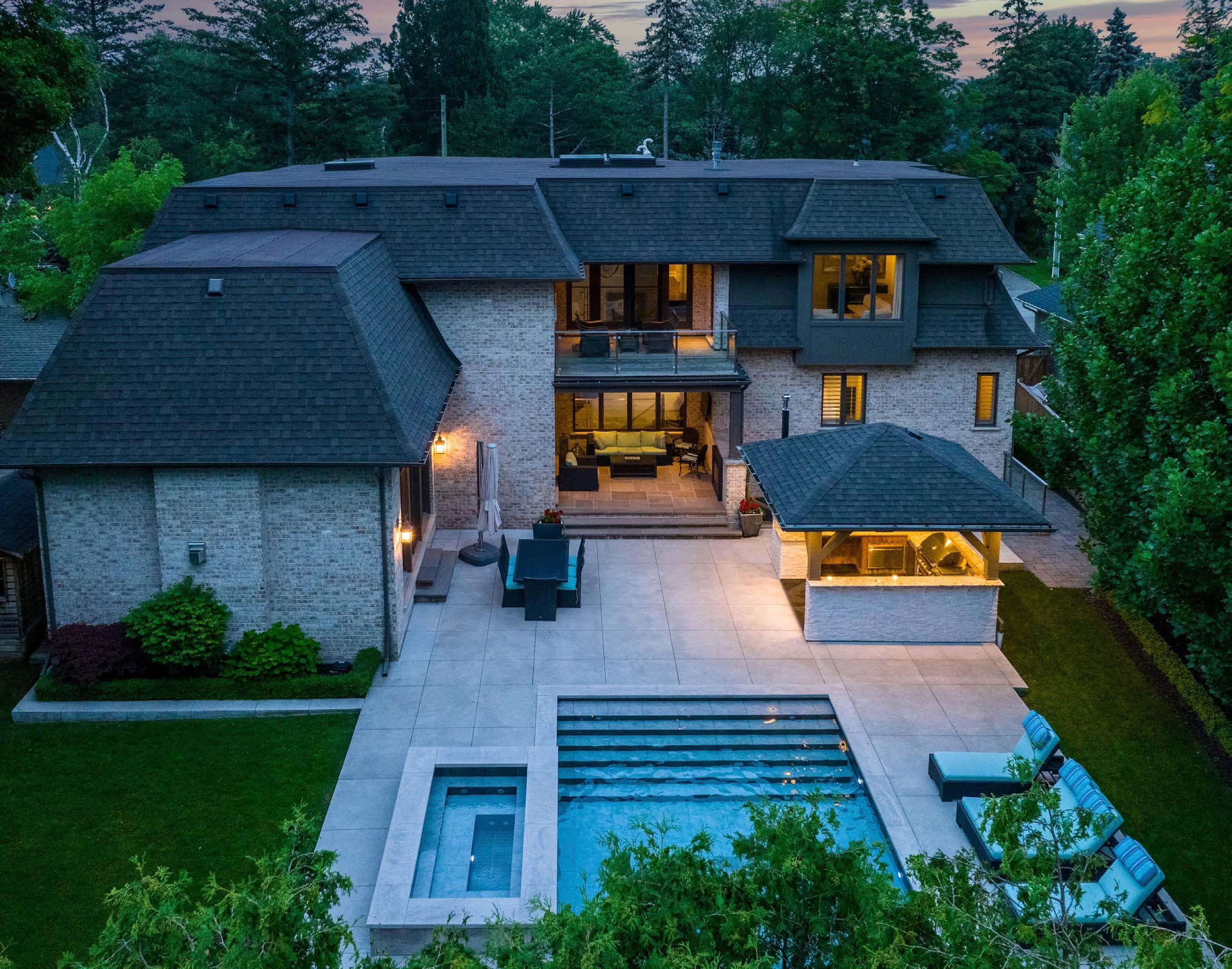 Exquisite custom built French Chateau style home. 4+1 bedroom, 7+1 bath and 6 Fireplaces with a transitional interior styling. This is a reflection of the superior design and quality that is rarely seen even in coveted Southeast Oakville. Approximately 8500 sq.ft. of luxurious living space offering everything the most discerning buyer could hope for. Wrought Iron fencing and electronic gates offer security and privacy while elevating the look and feel of this home. Exceptional design incorporates natural elements including Indiana limestone, rare marbles imported from Italy, walnut hardwood flooring and a custom designed stainless steel and glass staircase that is an architectural highlight of this home. The open concept floor plan is perfect for family living and entertaining both inside and out. Double height and vaulted ceilings in the foyer, hallway, living and great room ensure an abundance of light floods into every room. The Chef’s kitchen is grounded by an exquisite 12 foot waterfall island of imported Italian Calacatta marble which opens to a vaulted great room that is surrounded by walls of windows overlooking a resort style backyard. High-end appliances, a servery and a large pantry add to this luxurious kitchen. A separate dining room opens to the living room with vaulted ceilings and a floor to ceiling gas fireplace overlooking the front gardens. A main level office, laundry room and a large mud room with access to the garage and back garden houses a 3 piece bath room for convenient access from the pool. The second level offers a primary suite with a fireplace and walk-out to a covered second level balcony overlooking the treetops, a lovely spa-like ensuite and custom walk-in closet. Three more light filled bedrooms, all with ensuite baths complete the second level. The lower level offers everything a discerning buyer could ask for from a walk-up to the yard, a theatre room, radiant heat, an oversize media area, wine cellar, wet bar, and a large gym with full bath and steam shower. The outdoors are simply fabulous with extensive hardscaping and professionally landscaped gardens that ensure privacy. A covered porch with a gas fireplace and television is only one of the many sitting areas to enjoy the warmer months. The cabana has an outdoor kitchen with a built-in Twin Eagle BBQ with double side burners, breakfast griddle, warming drawers, sink and fridge. The custom designed concrete pool is a piece of art, tiled with marble imported from Italy with a sheer waterfall element which is complemented by a hot tub made of similar materials. Pool equipment is conveniently located outside the walk-up in a concrete underground bunker. This is a home that has been meticulously designed with the highest quality materials and design elements.