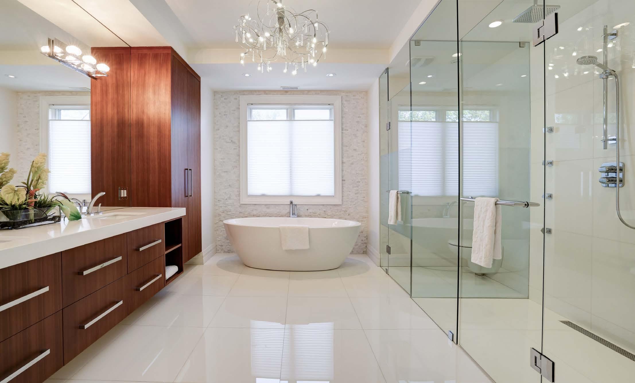 • White marble wall treatment in primary bedroom ensuite