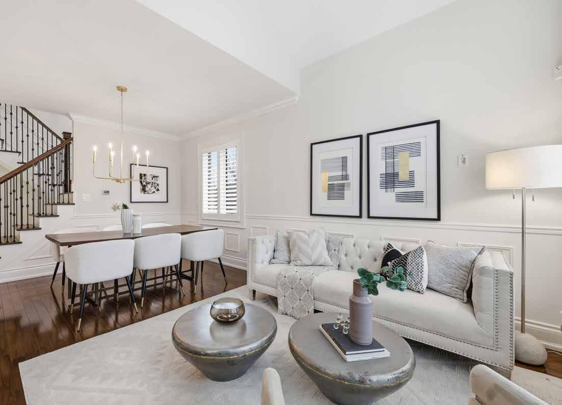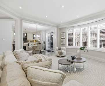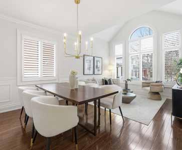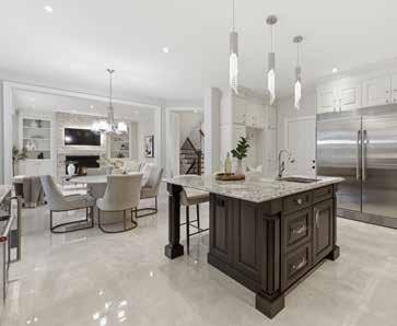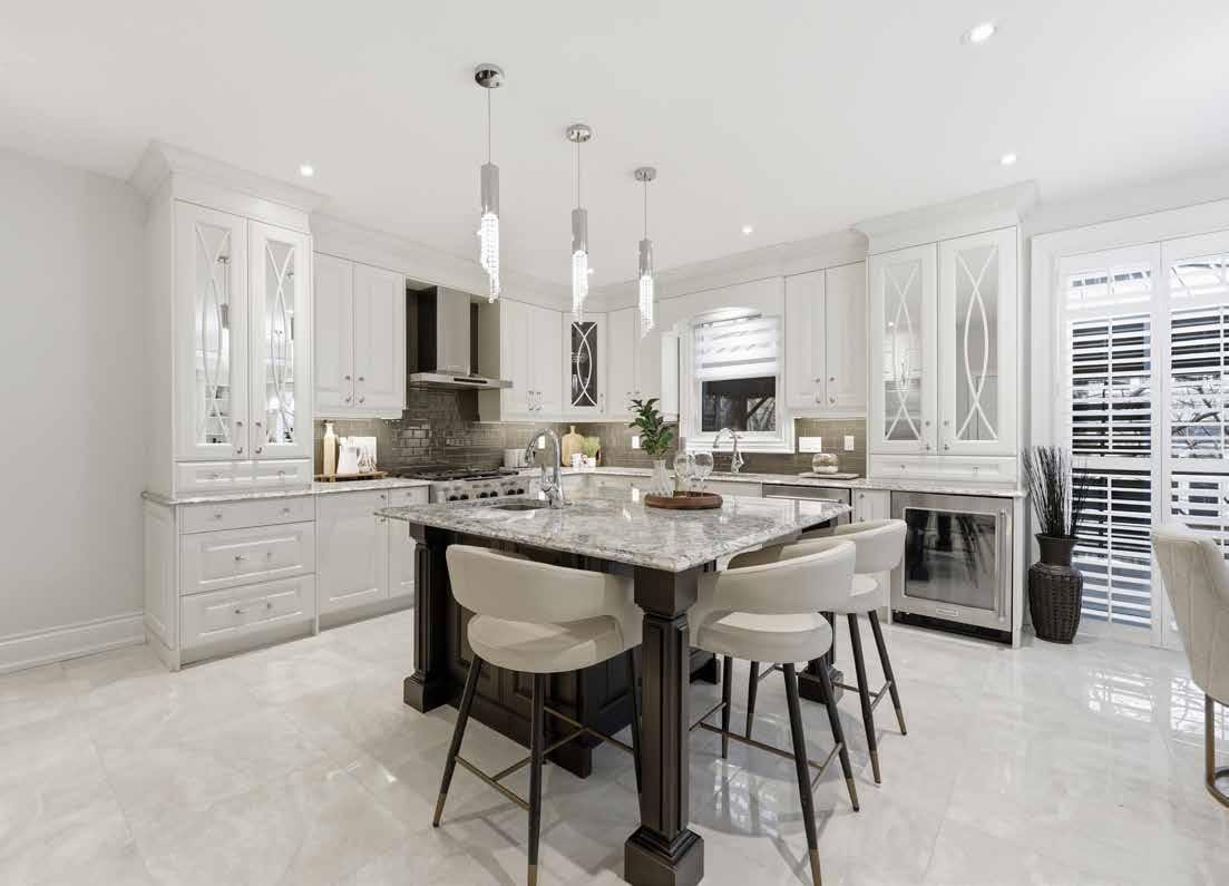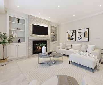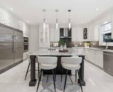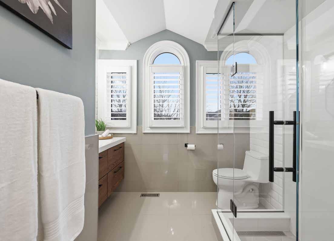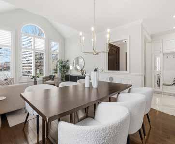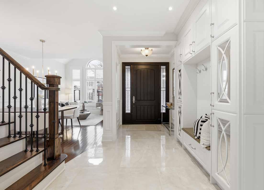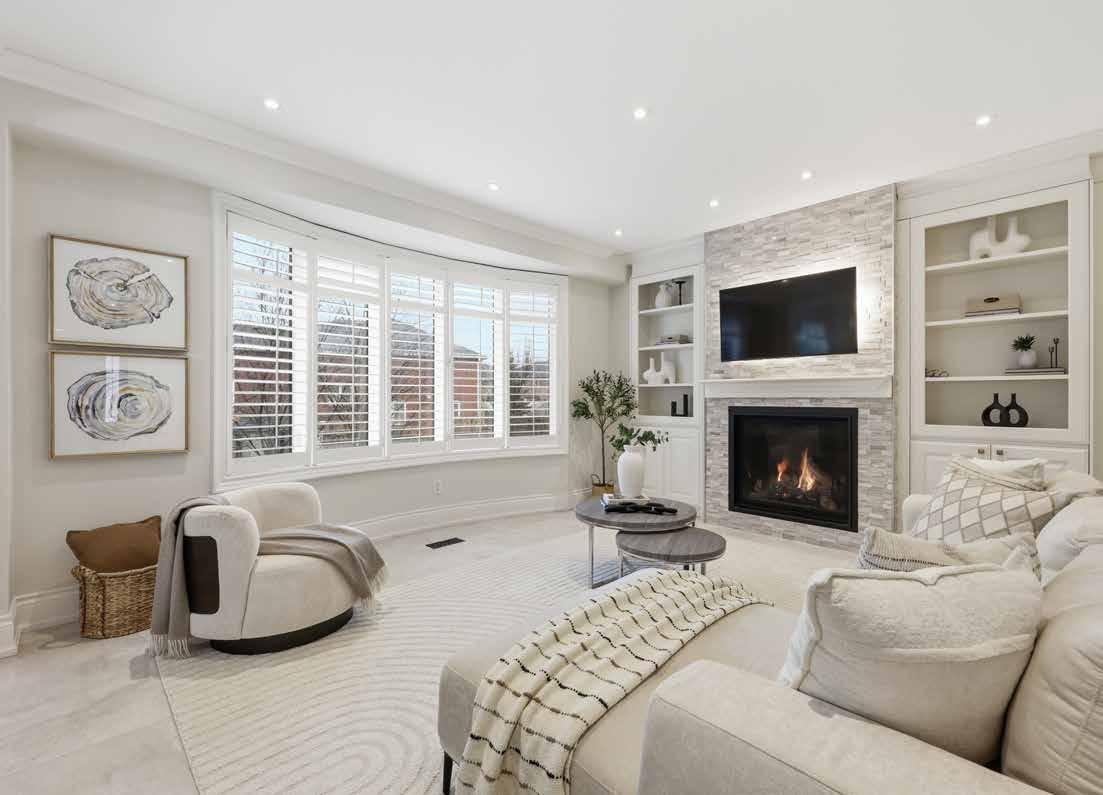 The formal living and dining areas are highlighted by a cathedral ceiling and an elegant Palladian window arrangement that fills the space with natural light. The chef-inspired kitchen is appointed with floor-to-ceiling custom cabinetry, quartz countertops, a contrasting centre island, and premium appliances. The welcoming family room is anchored by a stone-accented gas fireplace, offering a comfortable setting for everyday living.