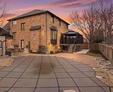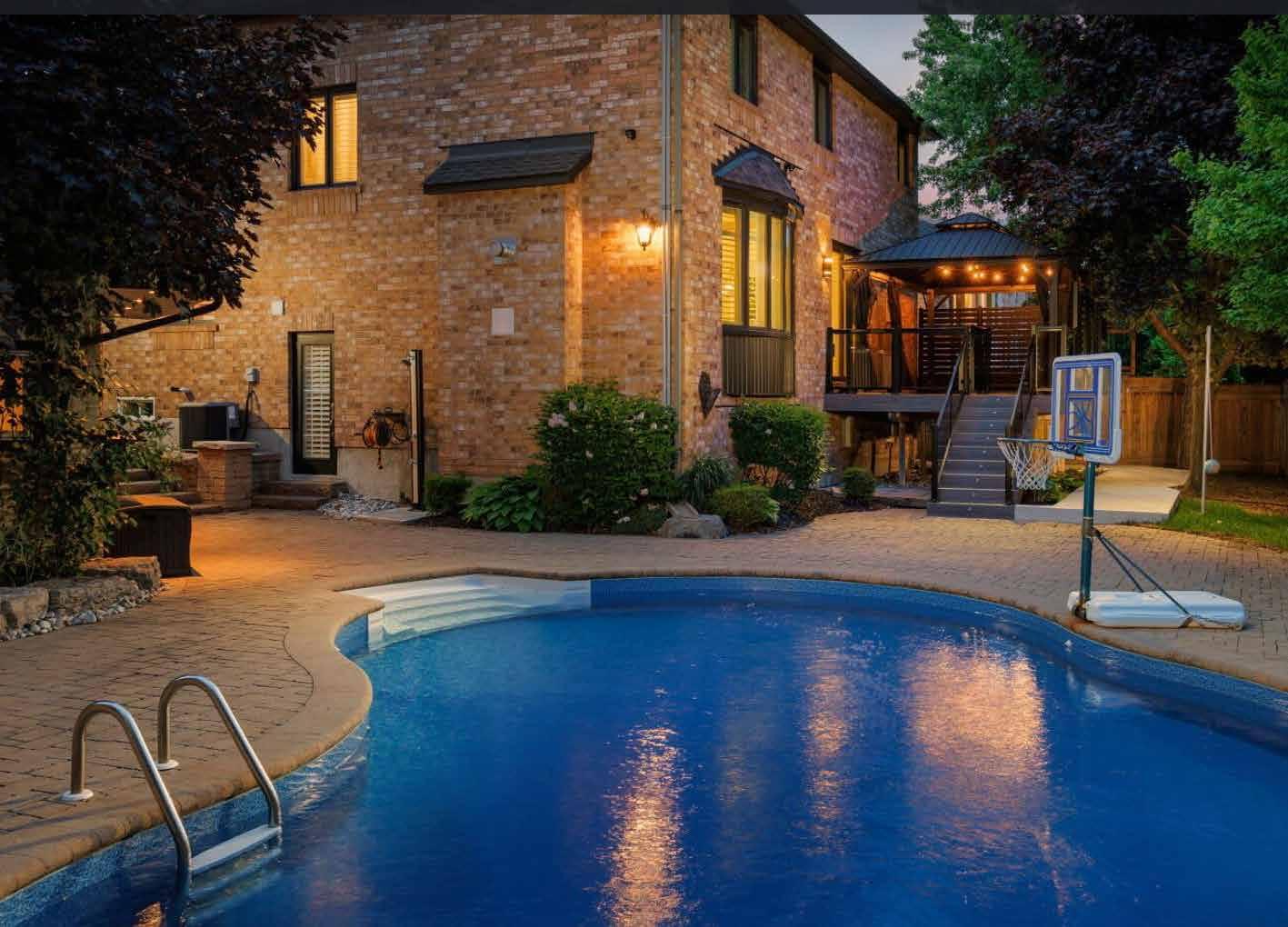 Step outside to mature trees, striking armour stone landscaping, custom lighting, and expansive hardscaping that combine to create a secluded, resort-inspired setting. The backyard centres around a beautifully appointed saltwater pool with natural diving rocks, encircled by more than 1,200 square feet of interlocking stone patios designed for both entertaining and relaxation. An elevated composite deck with modern glass railings overlooks the yard, while a spacious 12-foot by 20-foot gazebo and a fully insulated cabana with a change area further enhance the outdoor living space.