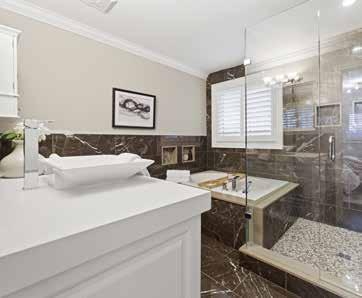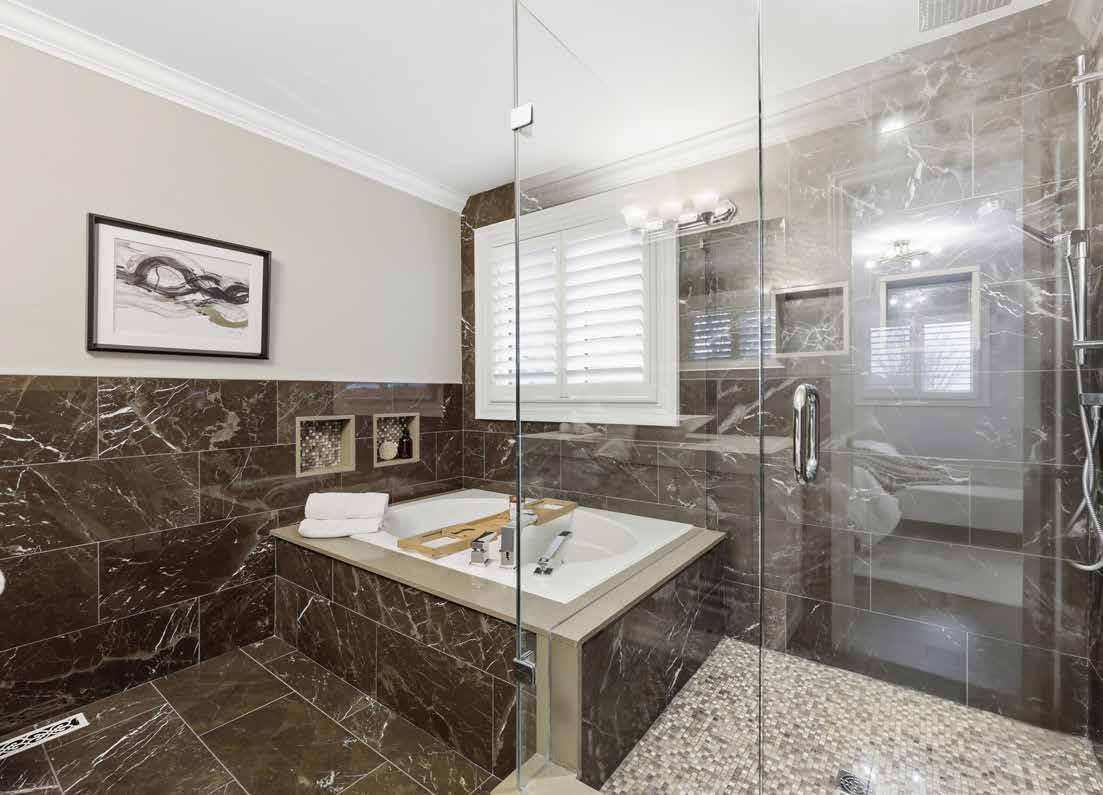 • Oversized marble tile shower with 2 shampoo niches, overhead rain shower head and additional