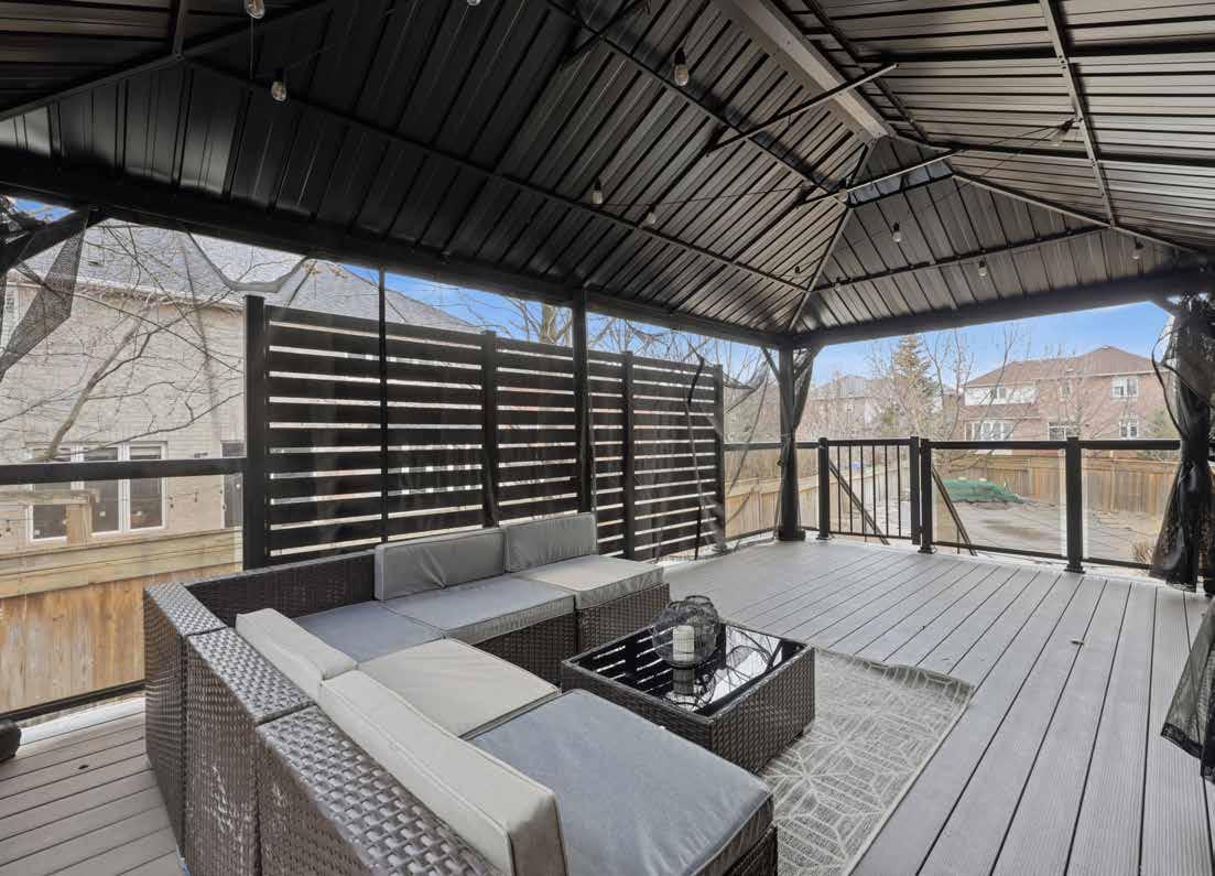 • Sliding glass doors with California shutters to the private composite wood deck with gazebo & glass panel railings overlooking the pool and interlock patio