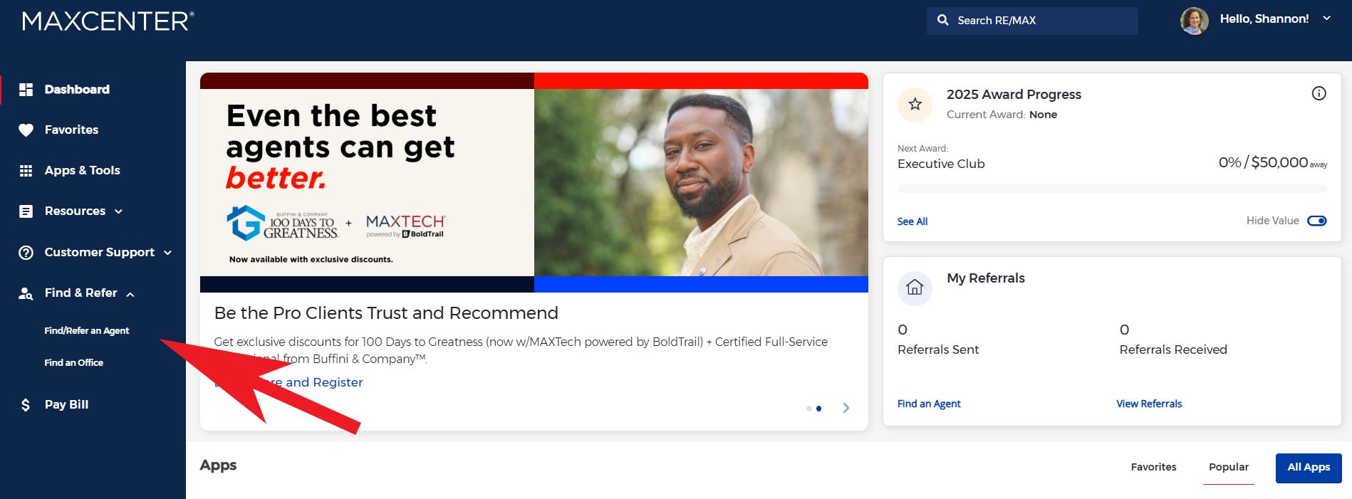 Agent to Agent referrals are a founding principle of RE/MAX, and it’s made easy with the RE/MAX Affiliate Roster. Search for an agent in any location and create your referral agreement right from the website. Log into MAXCenter and under “Find & Refer” select “Find/Refer an Agent”.
