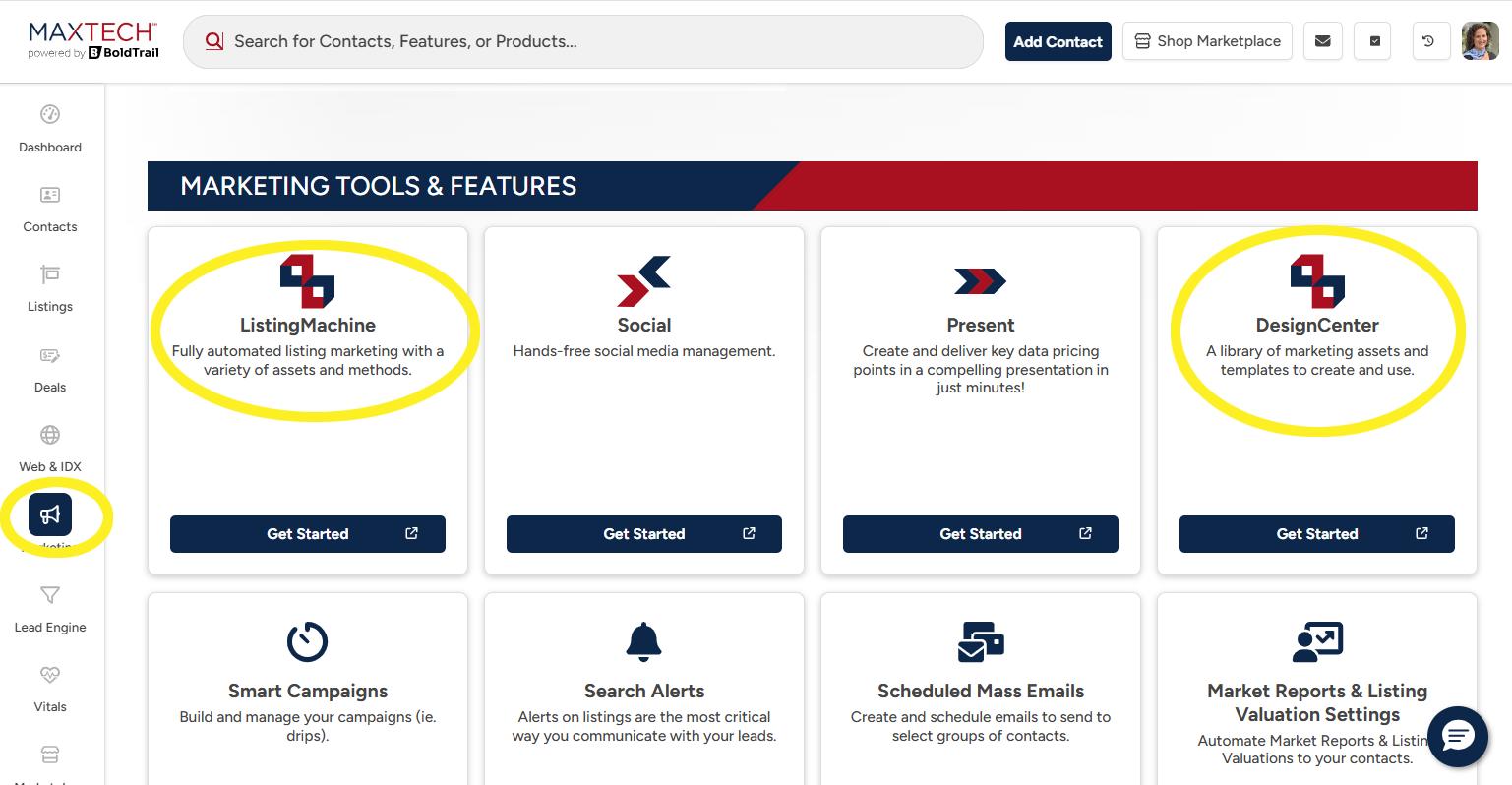 Accessed through the Marketing tab inside MAXTech powered by BoldTrail. Key Features of Listing Machine & Design Center include: