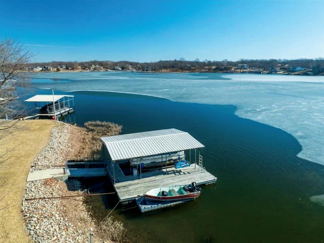 Down by the shoreline, you'll find a one-well covered dock with a swim platform, perfect for boating and swimming, along with a covered patio area and a convenient storage shed for all your lake toys and gear.