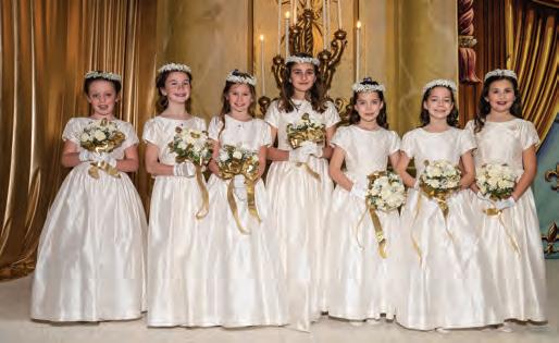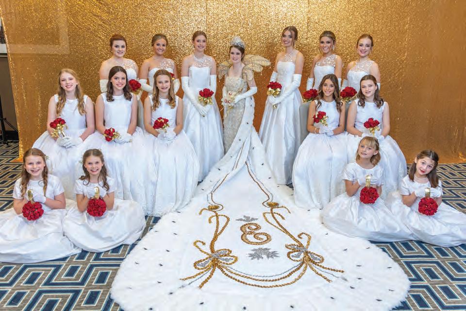 Court (from left to right): Miss Christy Rayne Charbonnet, Miss Nola Pearl Brown, Miss Claire Andree Dinwiddie, Miss Scarlett Jane Beasley, Miss Trinity Joan Foster, Miss Francesca Claire Lavigne, Miss Mary Lynn Fitzpatrick, Page Master Jefferson Waltz, with His Majesty, Page Master John Littleton LeBlanc, with Her Majesty Queen Olympians Miss Martha Grace Benedict Lapeyre, Miss Eloise Shay Clary, Miss Caroline Elizabeth Waltz, Miss Elizabeth Stallings