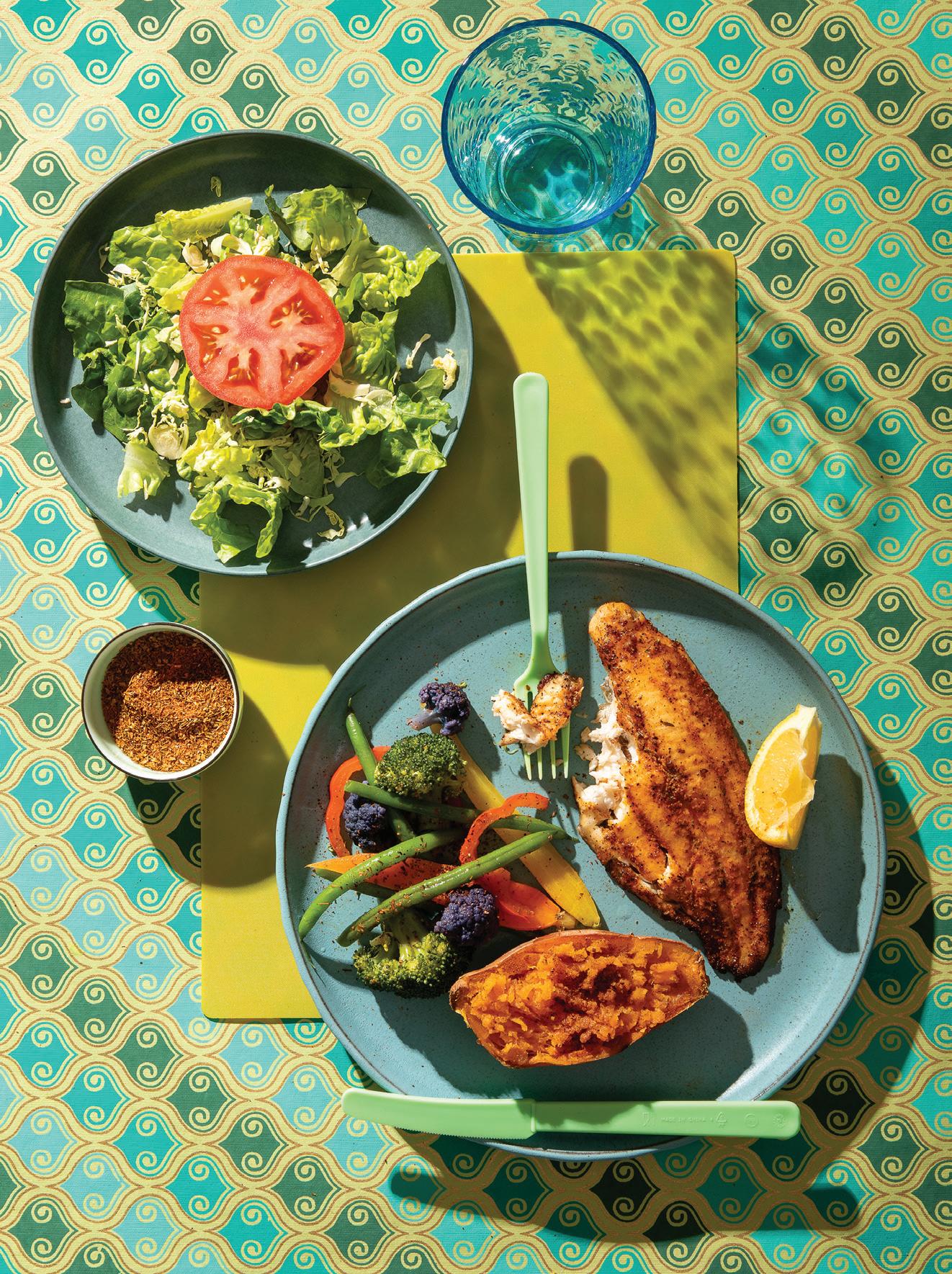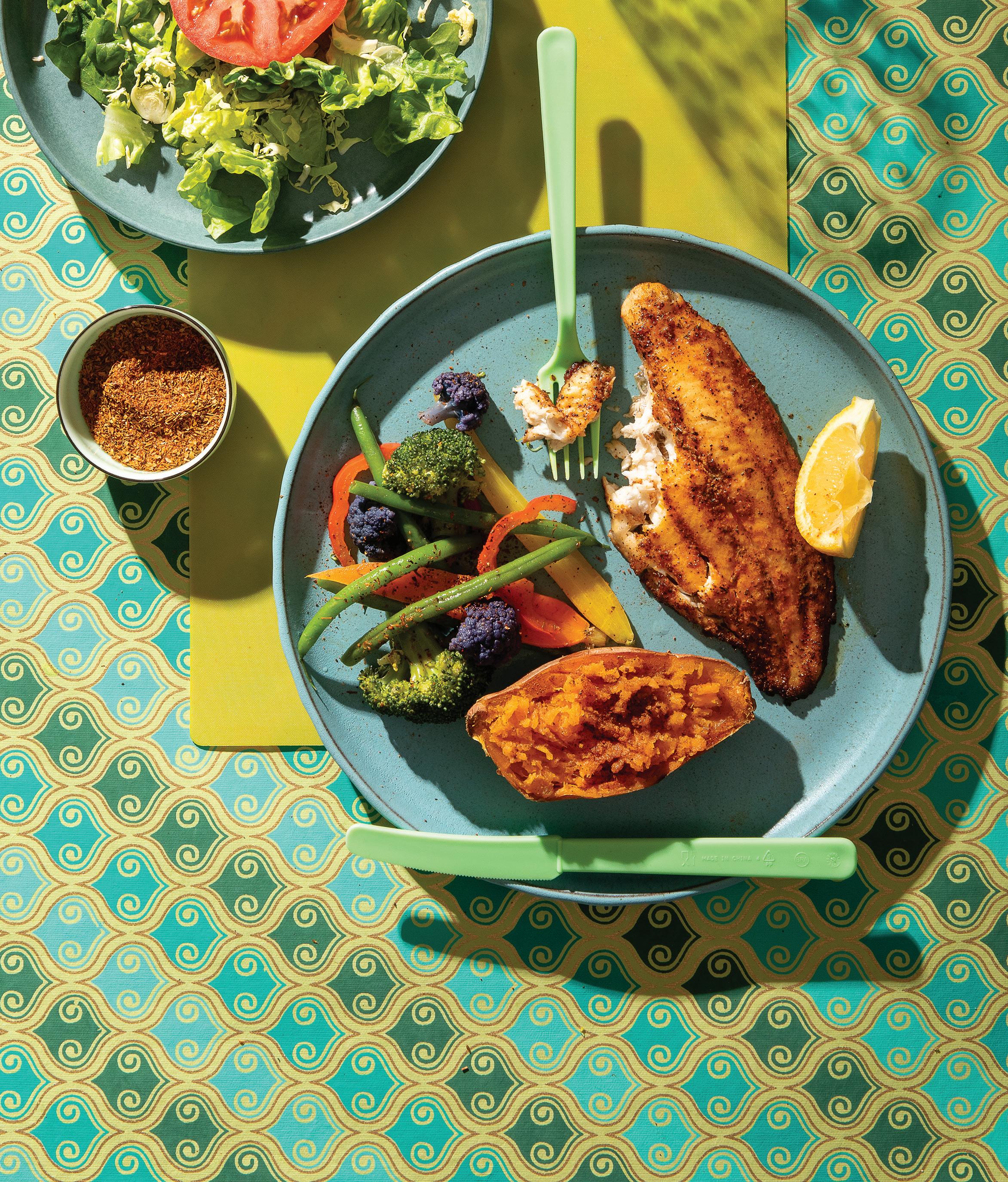 GRILLED BLACKENED CATFISH WITH SALAD, SWEET POTATO AND MIXED VEGETABLES