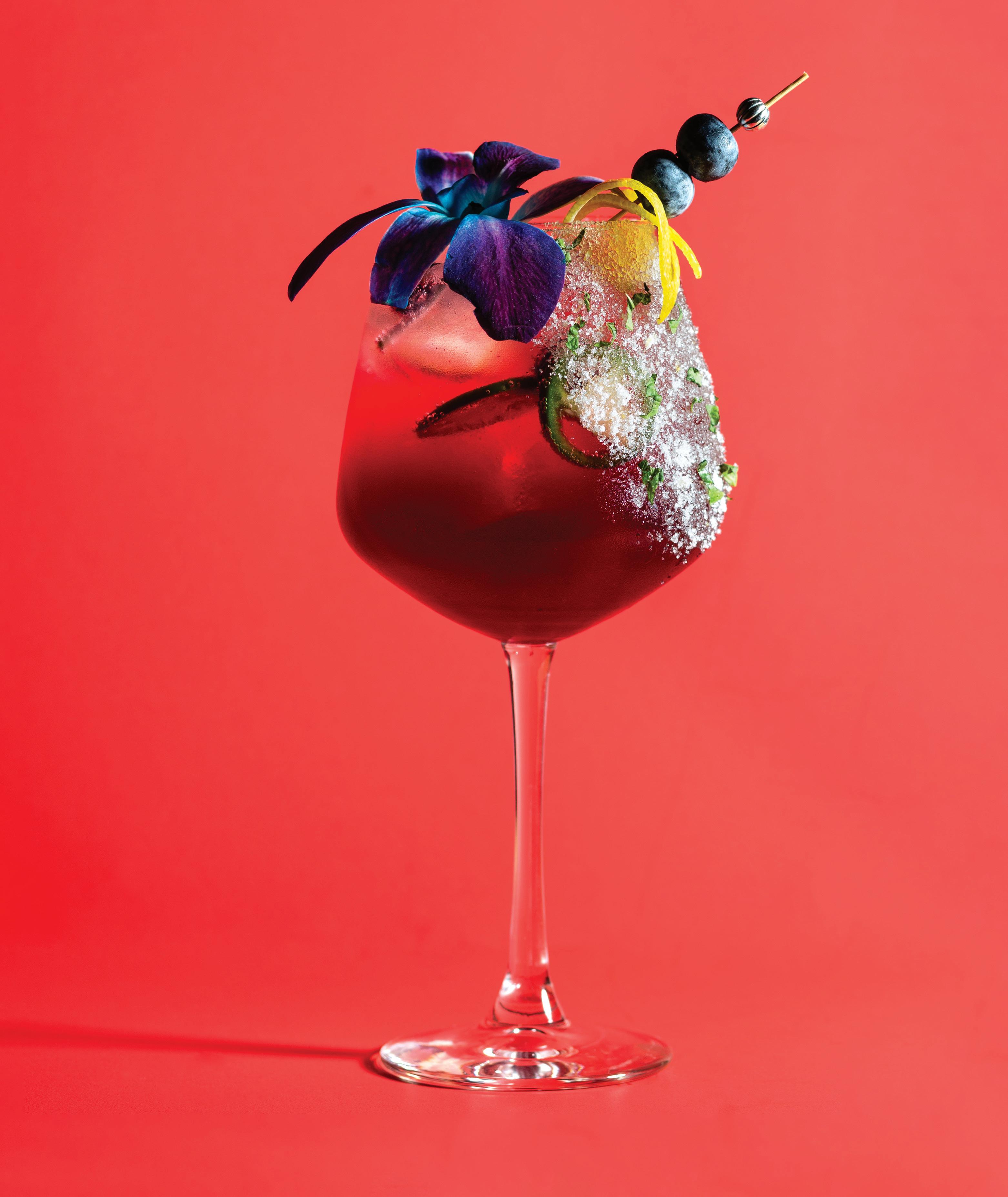 Tear 2 Thai basil leaves in half, muddle in a shaker with 2 oz. blueberry syrup (recipe online at acadianaprofile.com), then add 1 oz. honey water and 1 oz. fresh lemon juice. Add ice to shaker and shake well. Add fresh ice to wine glass. Pour shaker mixture through a cocktail strainer into glass. Drop several fresh blueberries on top, followed by 2-4 jalapeño slices (optional). Garnish glass with edible orchid and a pick with fresh blueberries, lemon peel and basil leaf.