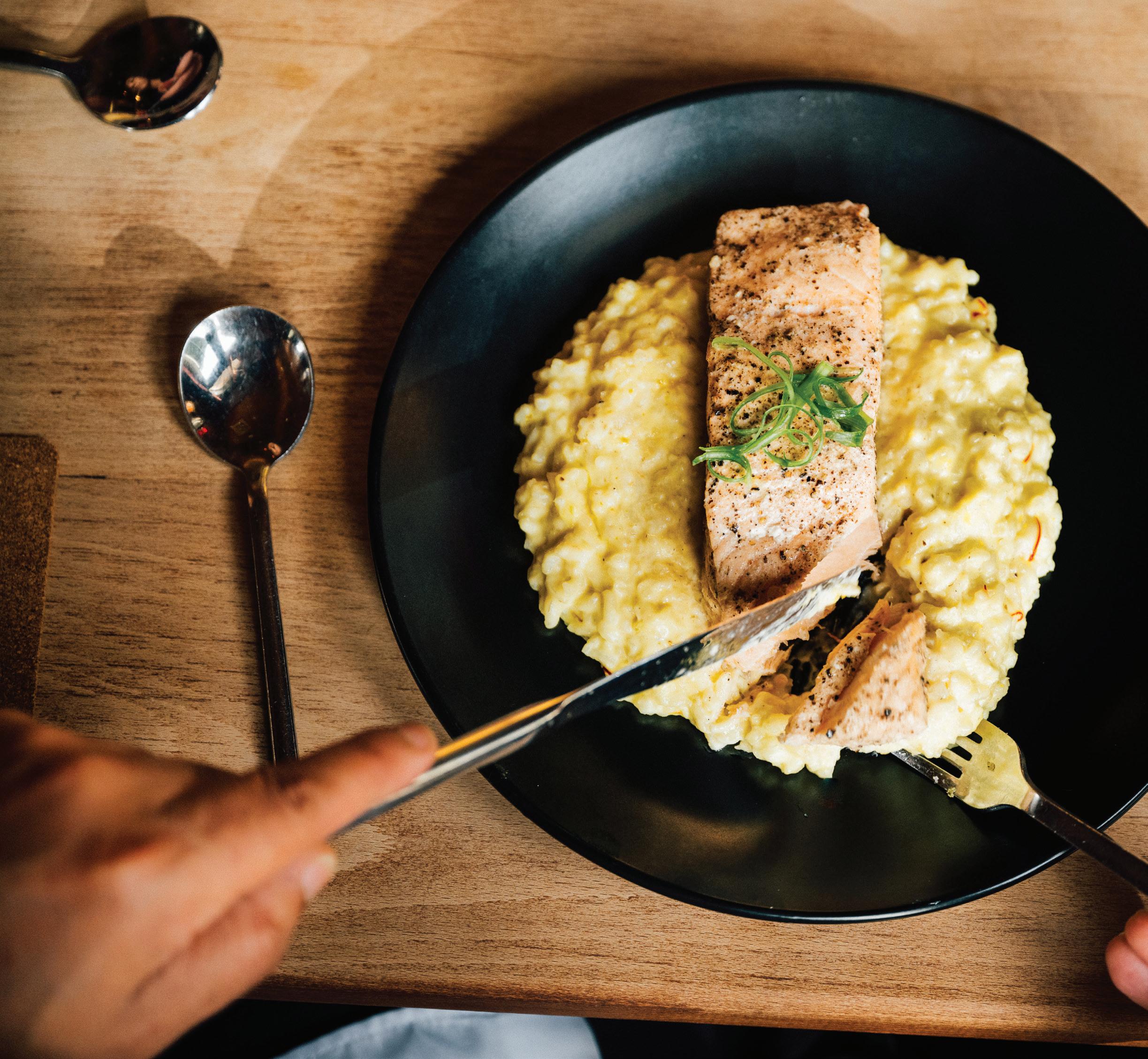 Another dish that he and Evans love to serve is the butter-poached salmon. The fish is cooked in an herb butter and served with saffron risotto.