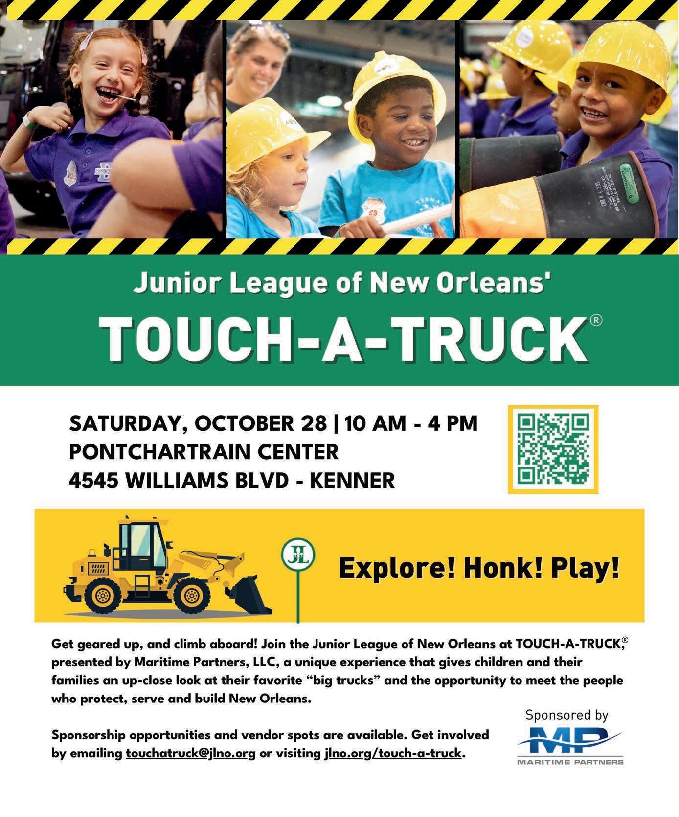 groups at our Headquarters through our facility rental program, and distributed essential diaper, period supplies, and adult incontinence products through our network of local partners. We invite you to connect with the Junior League of New Orleans by purchasing tickets to Get on Board and Touch a Truck® this October, attend Holly Jolly Market in December, and volunteer alongside us to sort and package essential supplies for community distribution at our Diaper Bank.