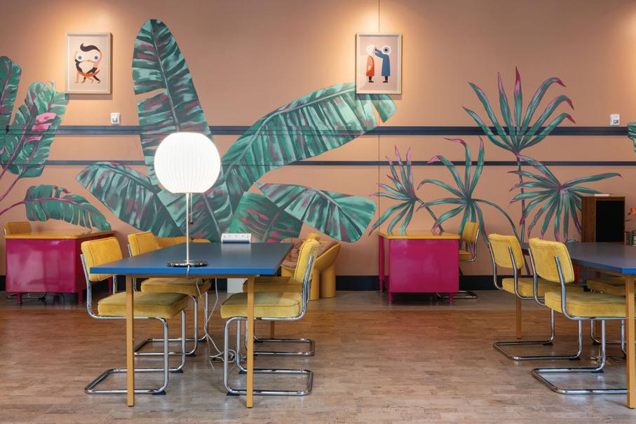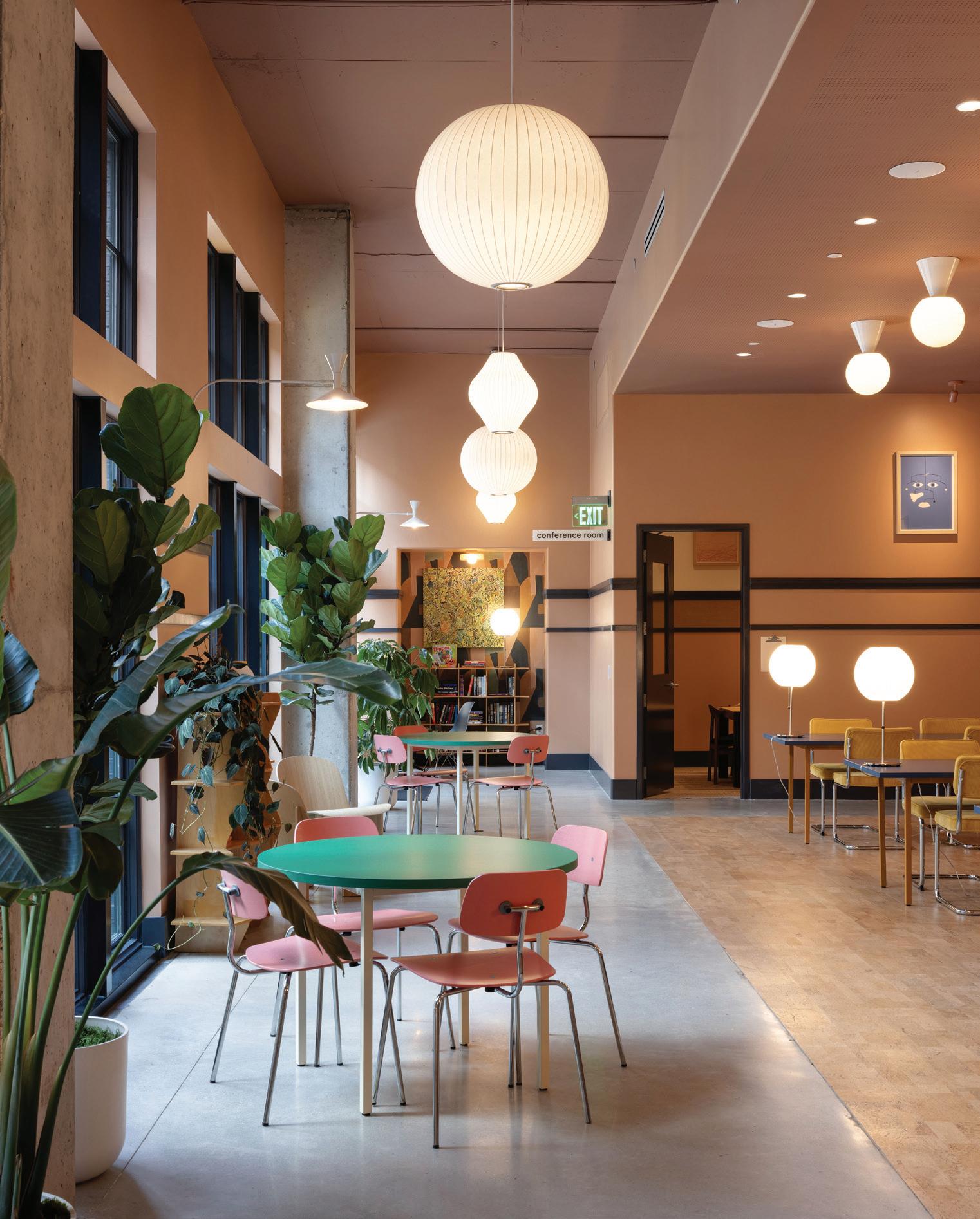 Common House includes a restaurant and bar, two event spaces, a social hall, open co-working spaces, private offices, conference rooms and more. Playful elements, such as hand-painted murals, harken back to the building’s former use.